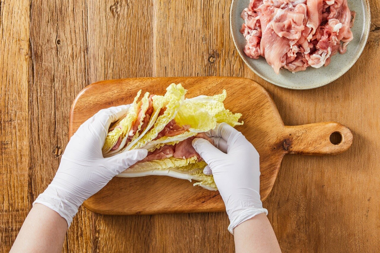 알배추 1/2포기를 세로로 자르고, 잎 사이사이에 밑간한 돼지고기를 한 장씩 끼워 넣어줍니다.