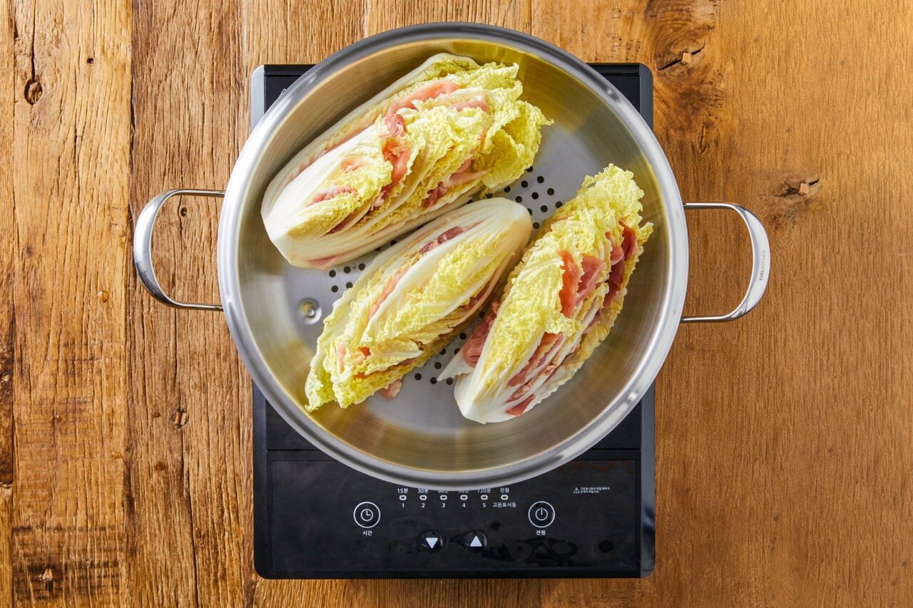 찜기에 배추를 넣고, 고기가 완전히 익을 때까지 12-15분간 쪄주세요.