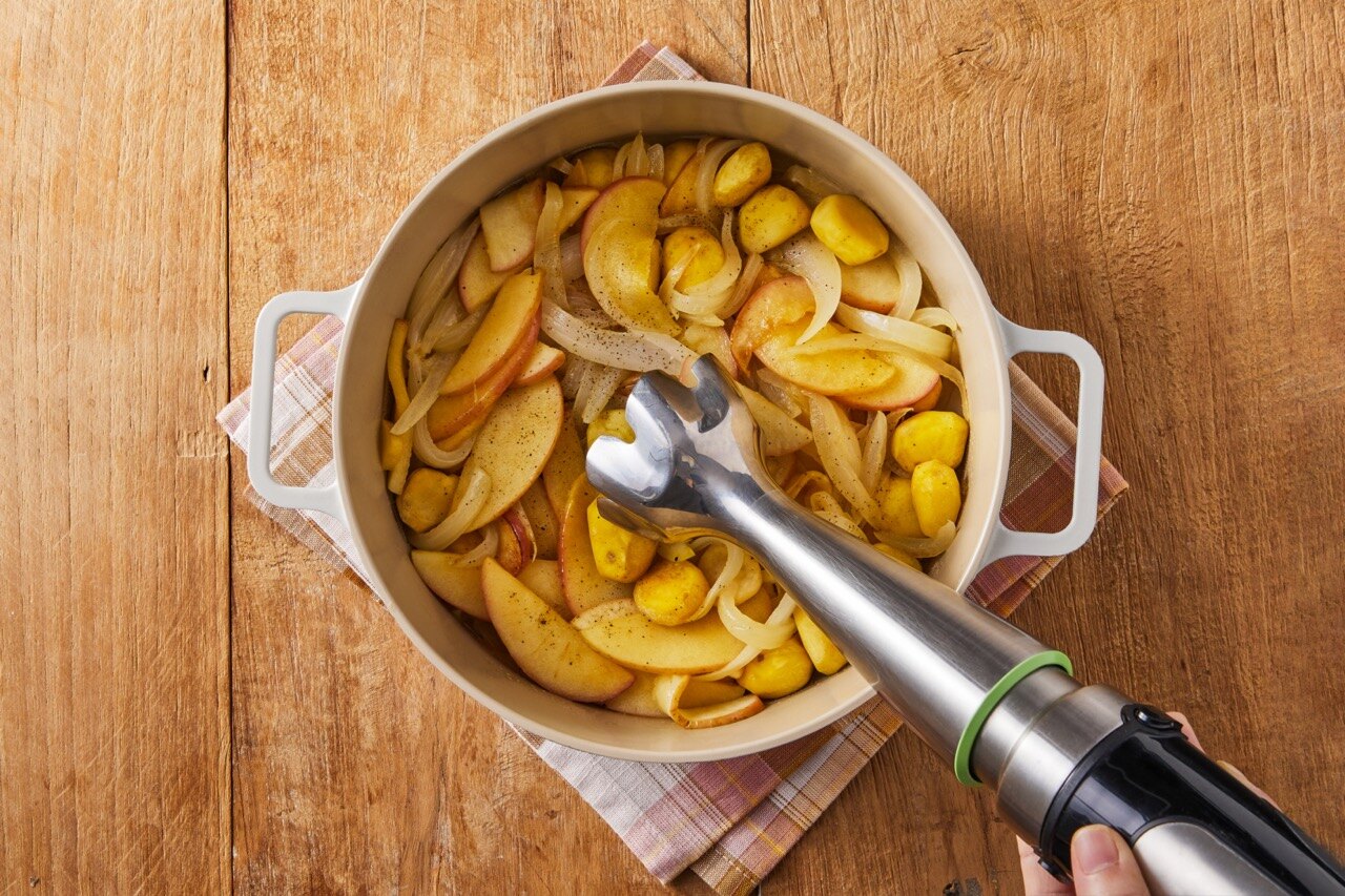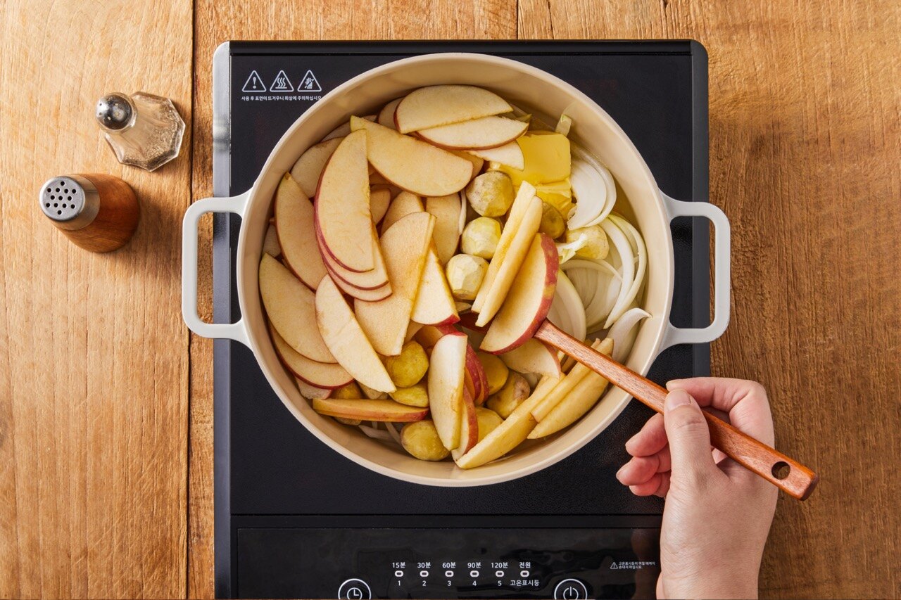 손질한 양파, 사과와 삶은 밤을 냄비에 넣은 후,
