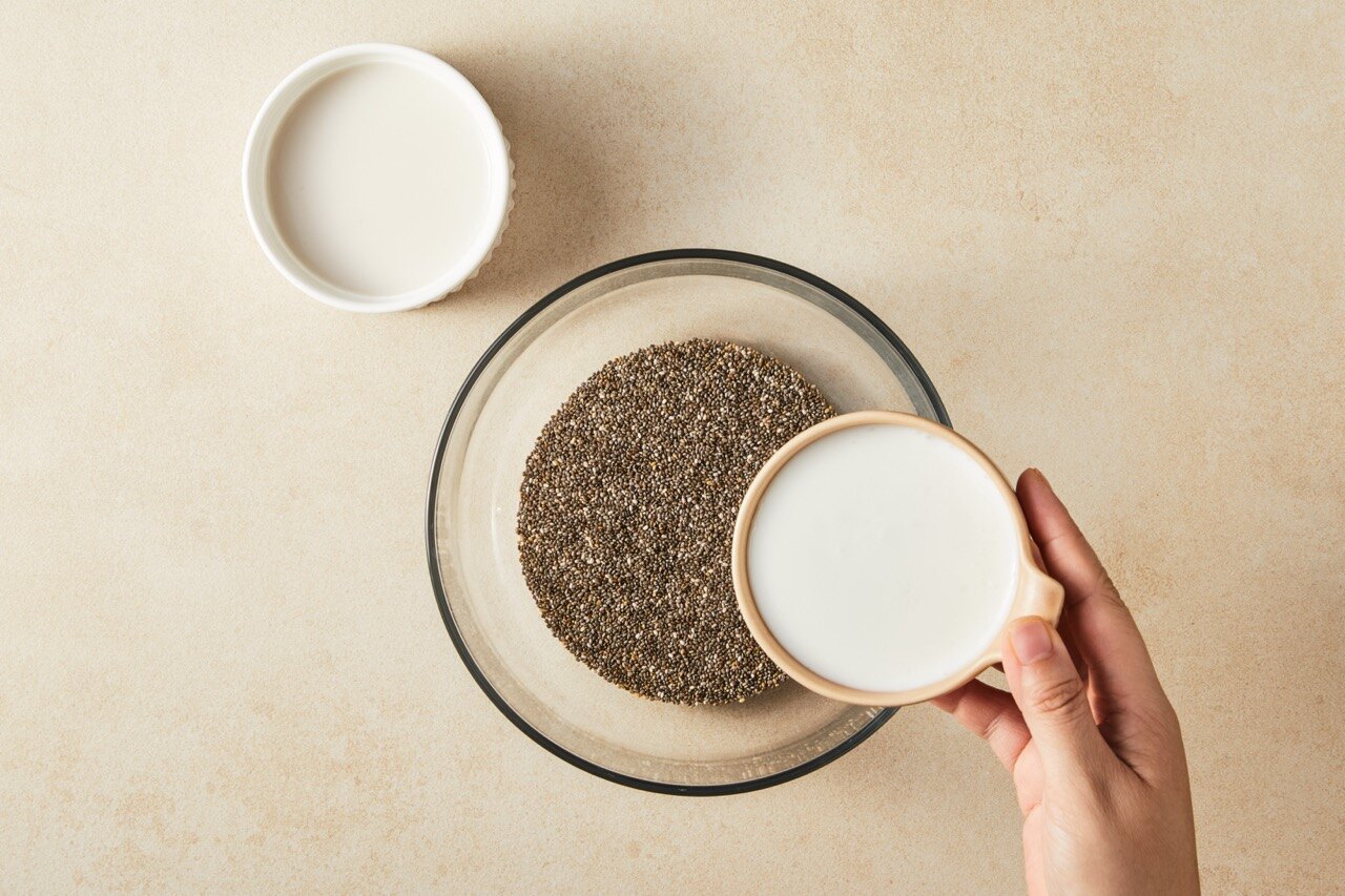 치아씨드에 아몬드 밀크와 요거트를 넣고 골고루 섞은 후