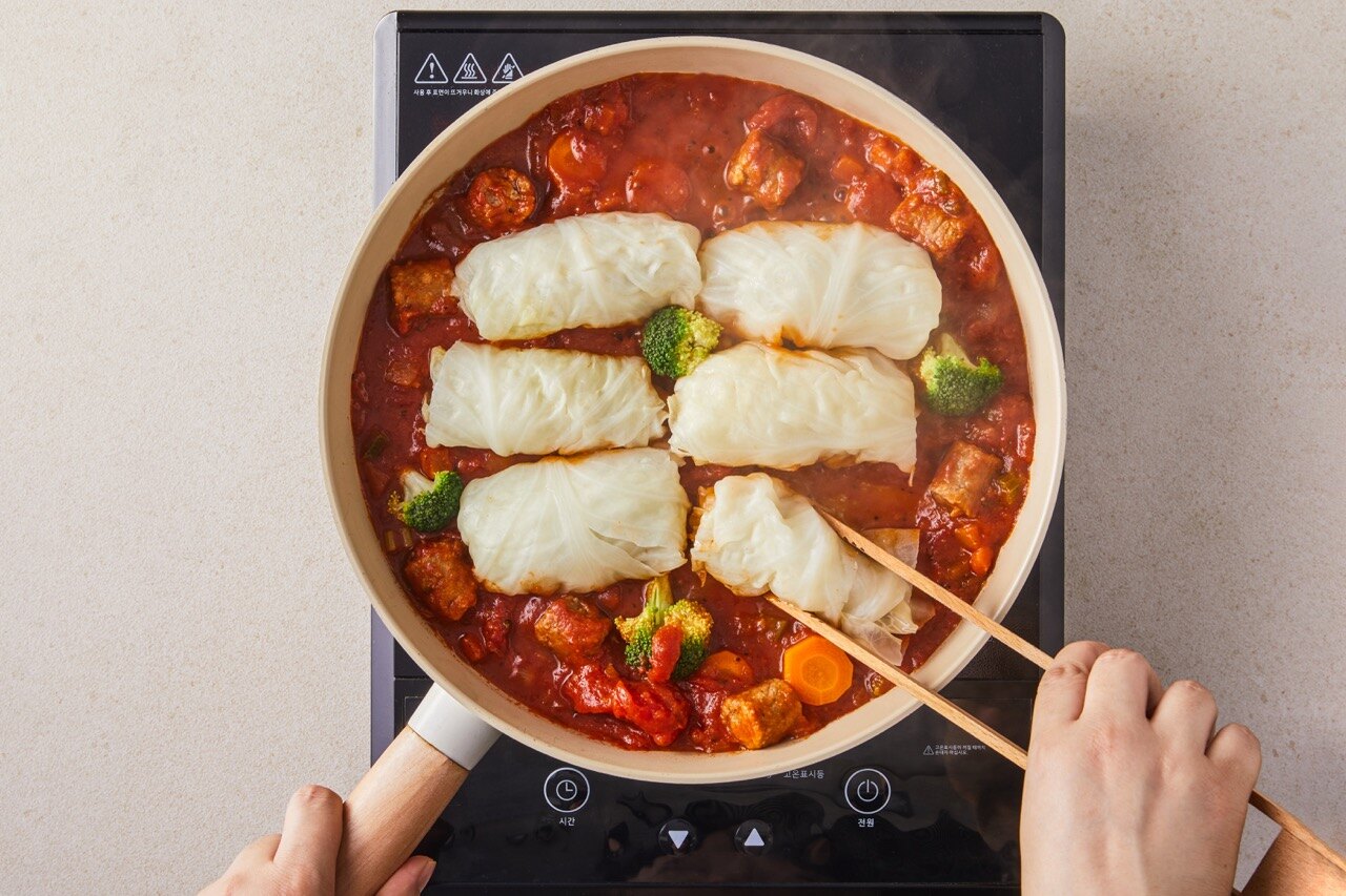 만들어둔 캐비지롤과 당근, 브로콜리, 방울토마토를 넣고 토마토 소스와 물 100ml를 부어 5분간 끓여 주세요.