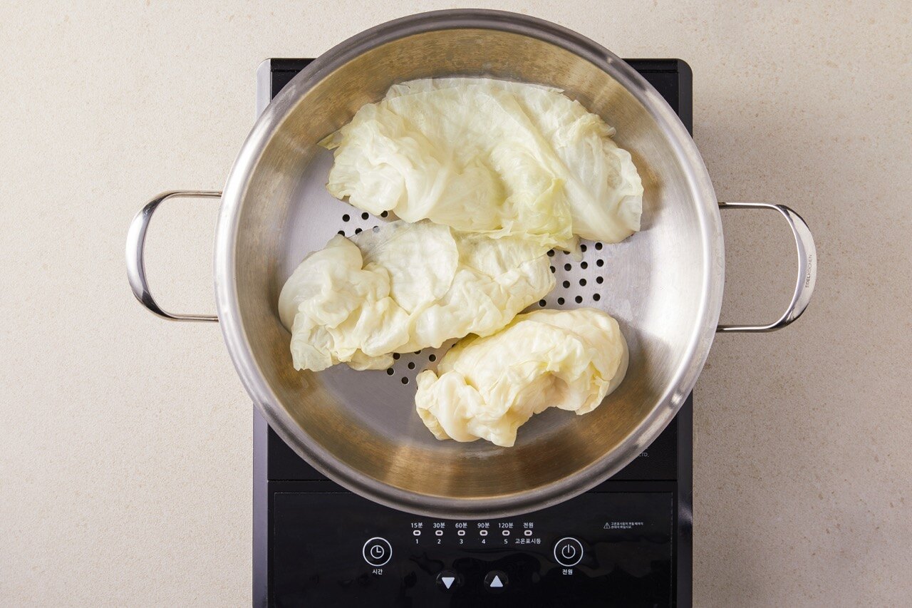 양배추의 넓은 잎을 골라 찜기에 5분간 쪄줍니다.