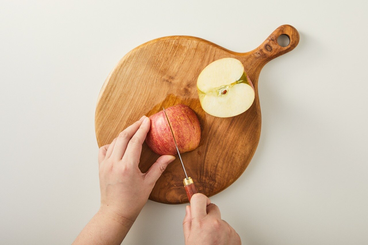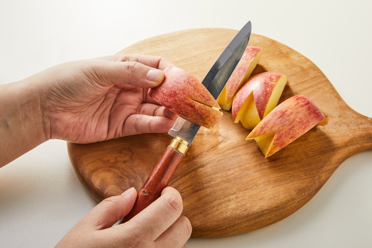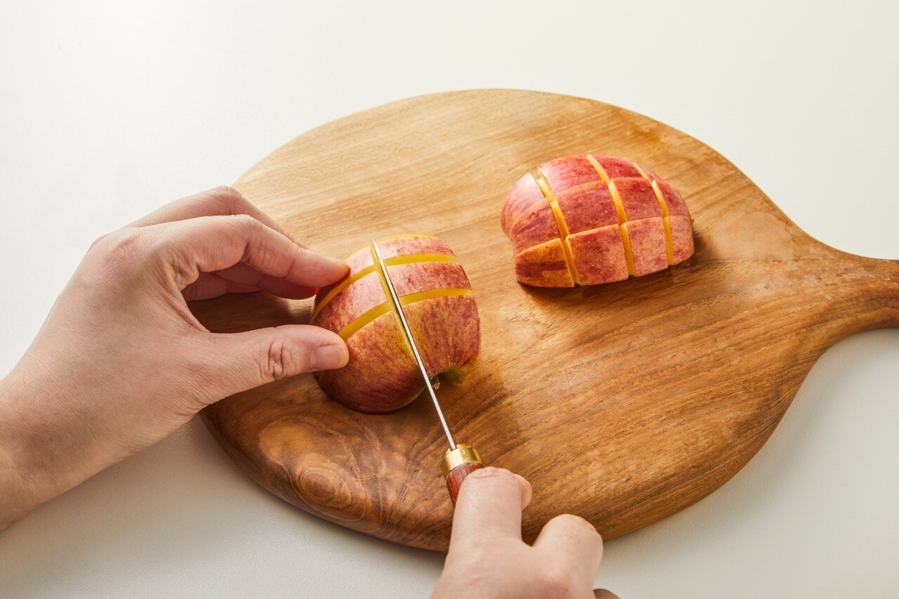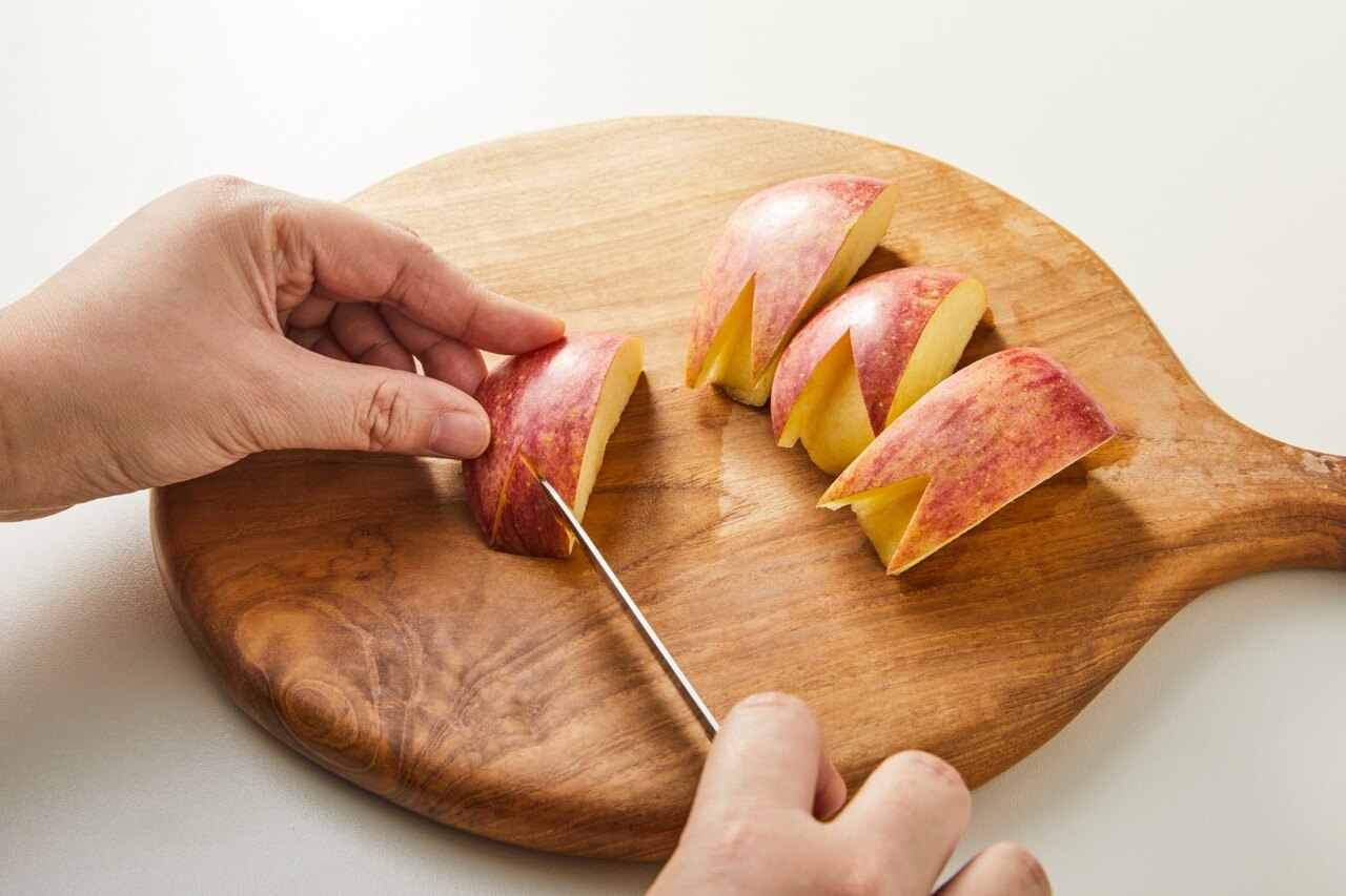 4등분한 사과를 사진과 같이 0.3cm 폭의 V자 형태로 홈을 내 주세요.