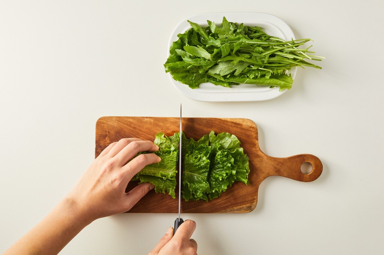 로메인과 와일드 루꼴라는 깨끗이 세척한 후 약 4cm 정도 먹기 좋은 길이로 잘라 주세요.