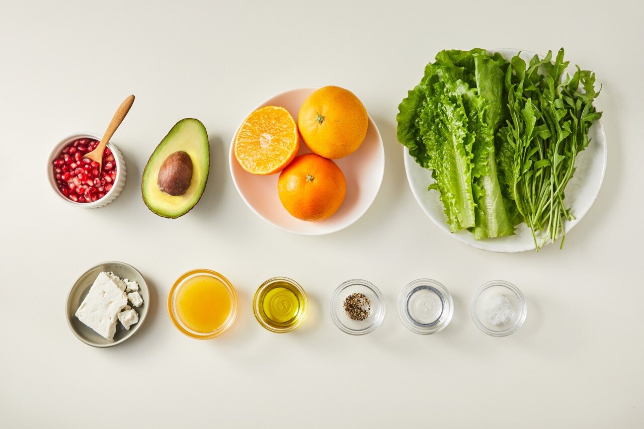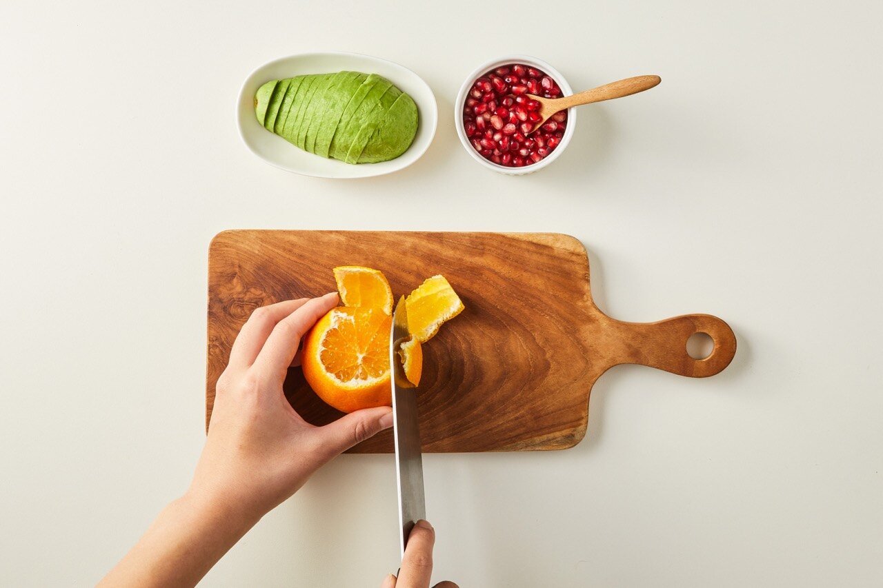만감류 과일은 윗동을 자른 후 껍질을 벗겨 원형으로 얇게 슬라이스 하고, 아보카도와 석류도 손질하여 준비합니다.