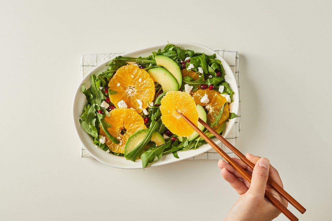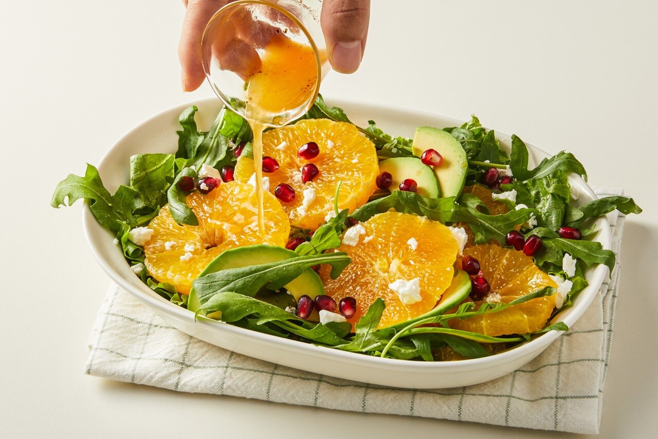 만감류 과일 1/2개를 짜내어 만든 즙에 올리브유, 소금, 후추, 올리고당을 잘 섞어 드레싱을 만듭니다.