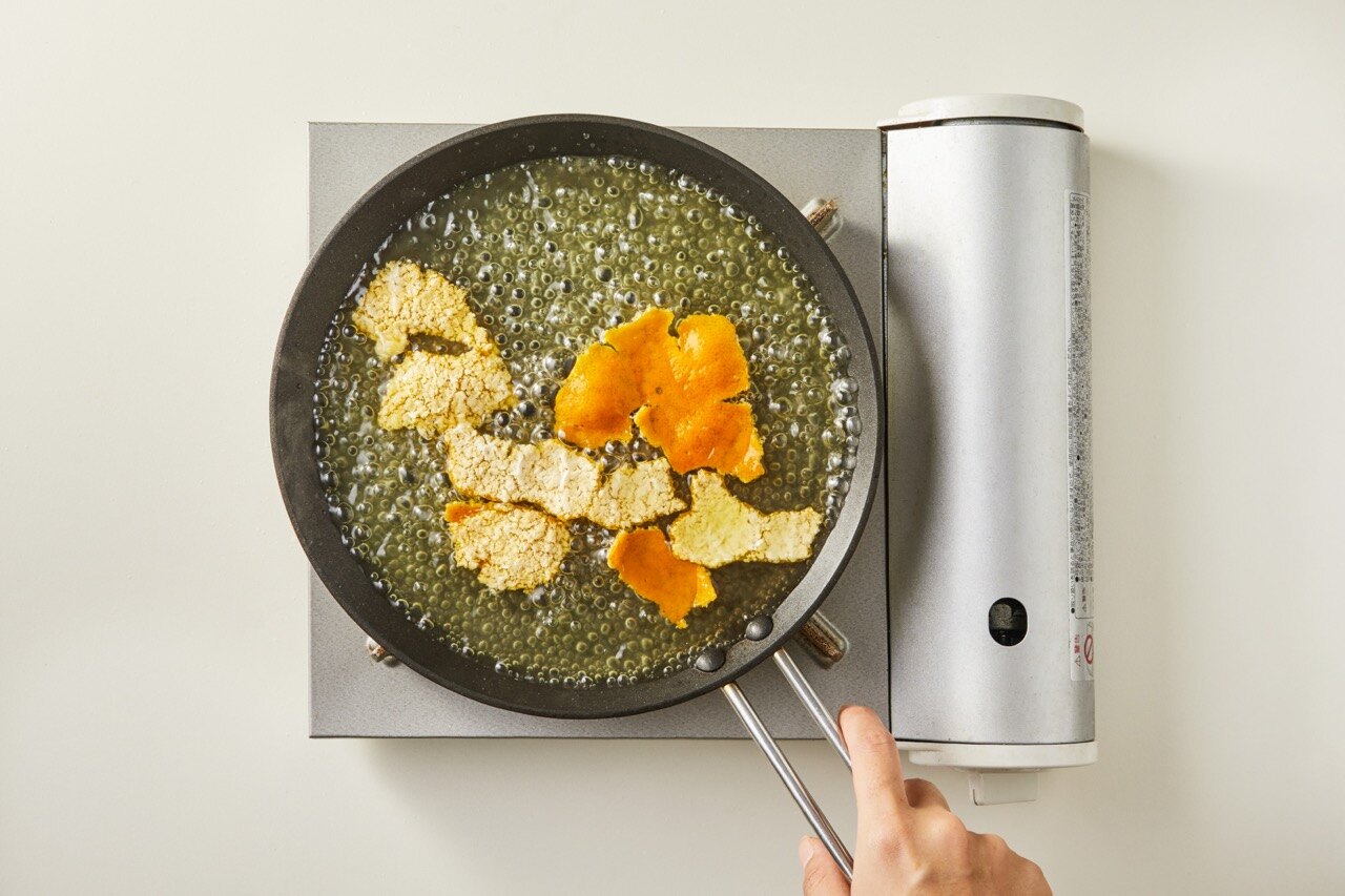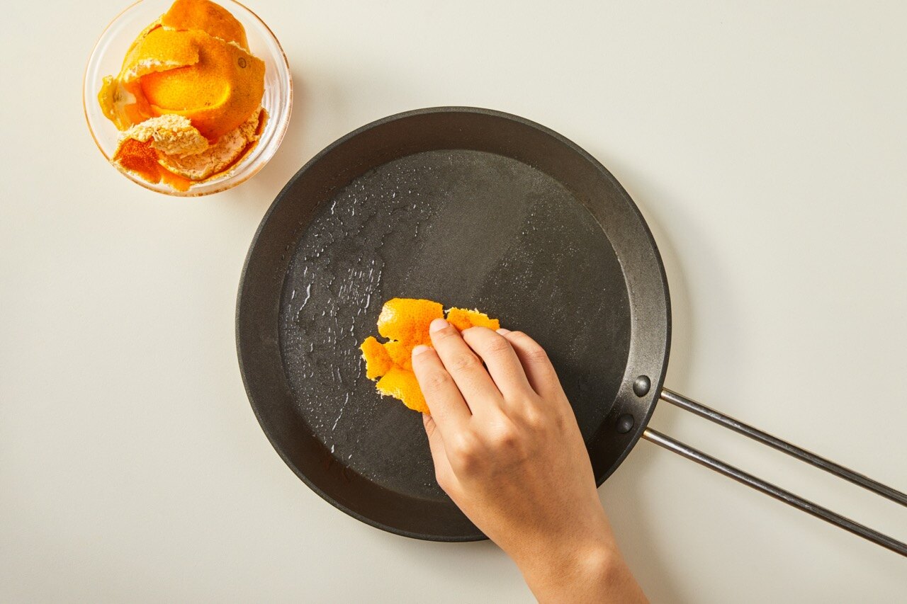 프라이팬의 잡내는 물과 귤 껍질을 넣고 충분히 끓여주면 상큼한 귤향이 냄새를 잡아준답니다.