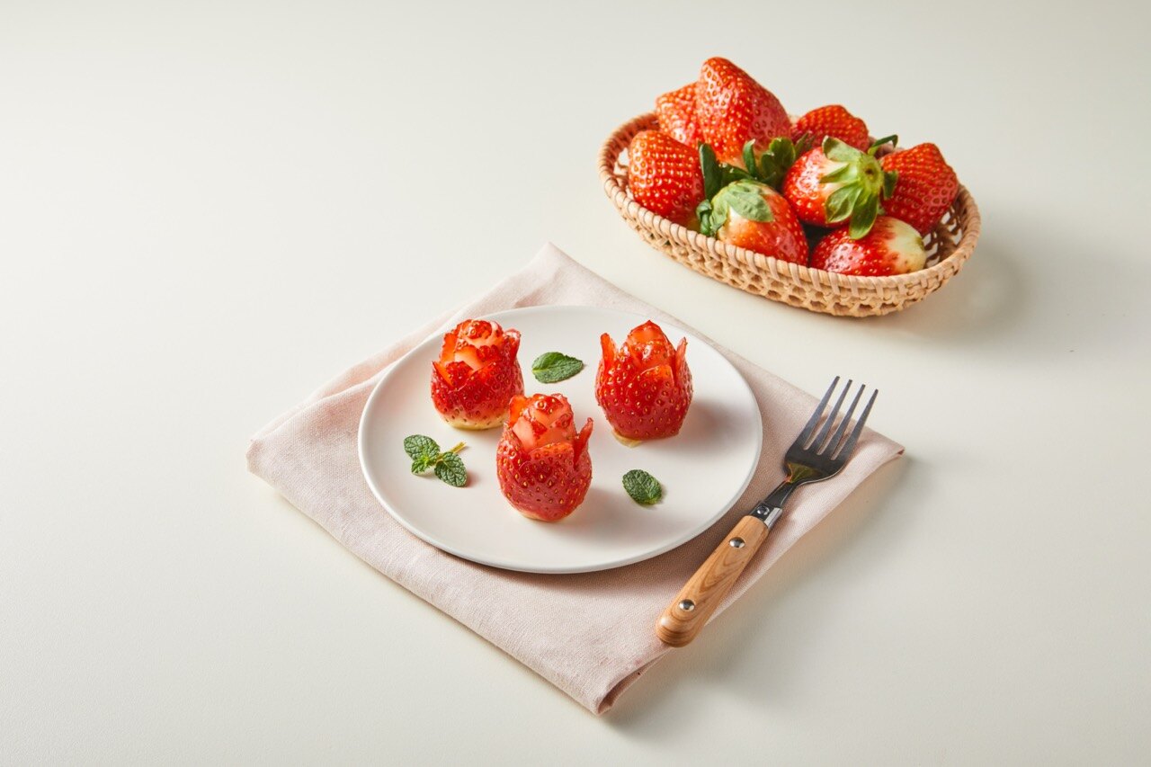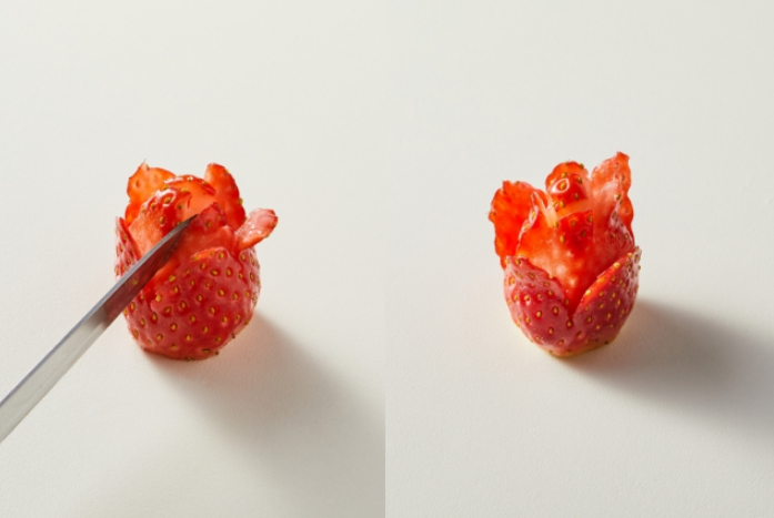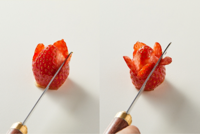 꼭지 부분을 손질한 딸기는 사진과 같이 삥 둘러가며 꽃잎 모양으로 칼집을 내 주세요.