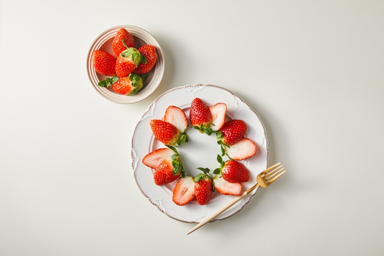 준비한 딸기는 사진과 같이 둥근 접시에 원형으로 플레이팅 하면 완성이에요.