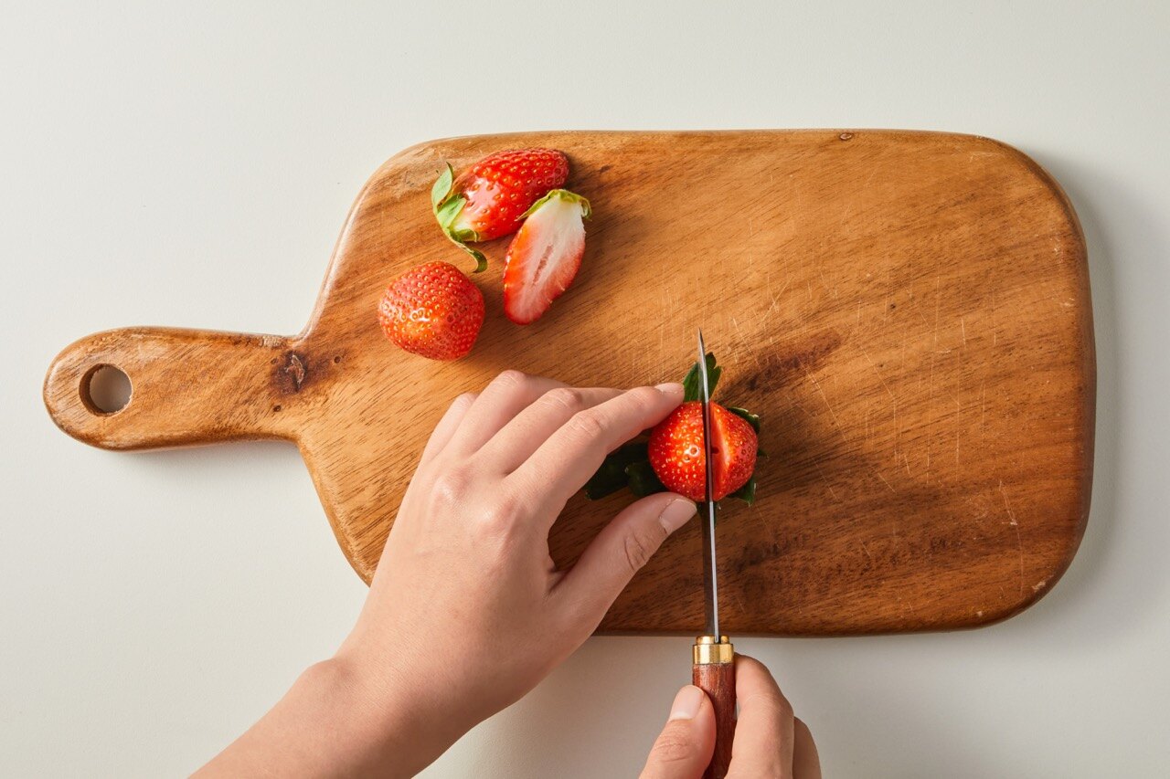 깨끗이 씻은 딸기는 하나씩 반을 갈라 준비해 주세요.