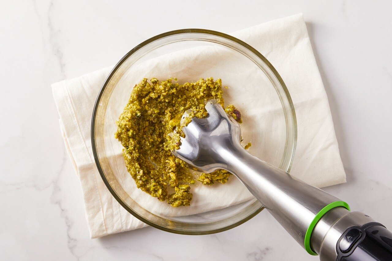 피스타치오를 핸드 블렌더로 곱게 갈아 주세요.