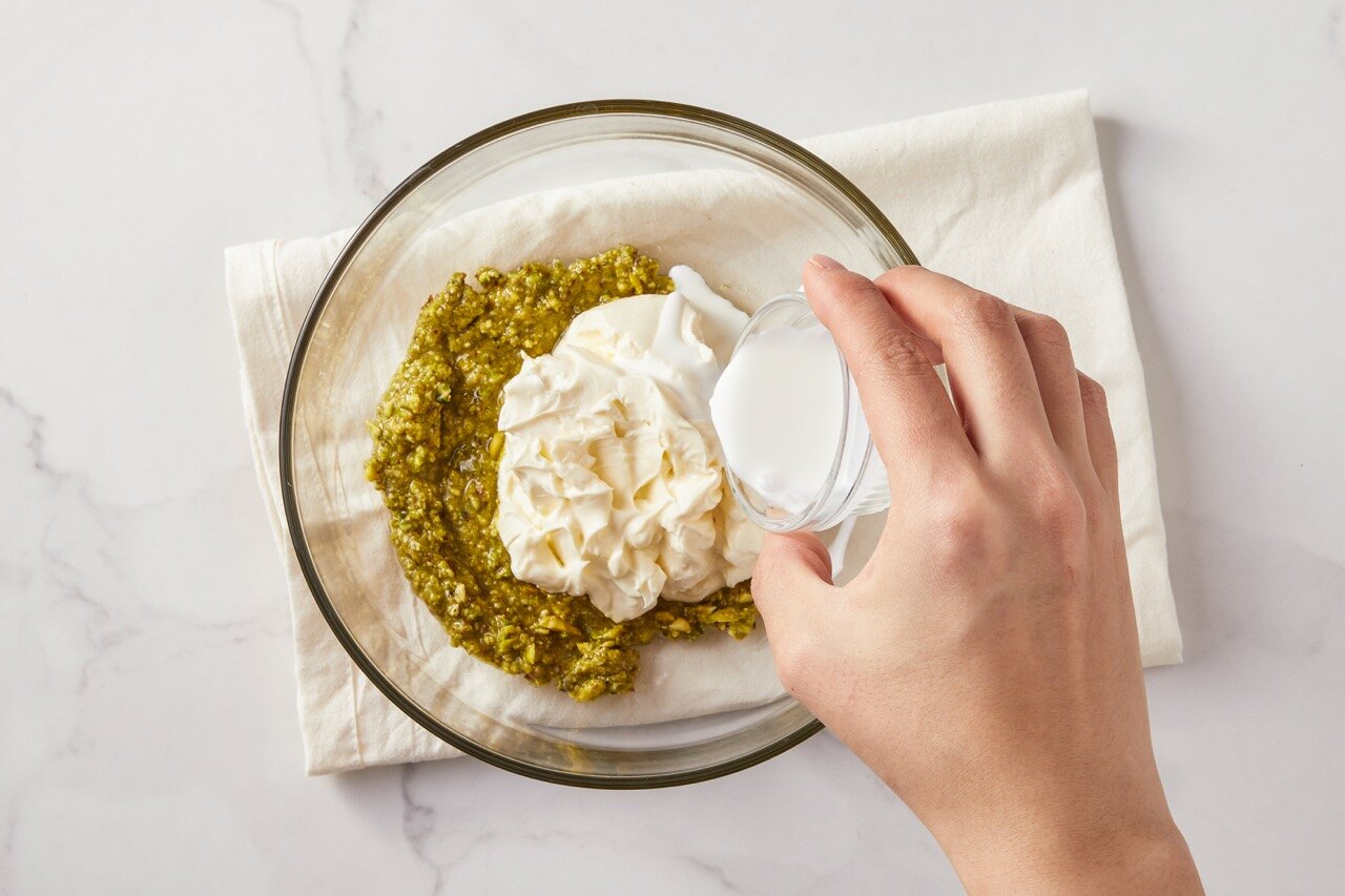 ②에 크림치즈와 생크림을 넣고 섞어 피스타치오 크림을 만들어 주세요.