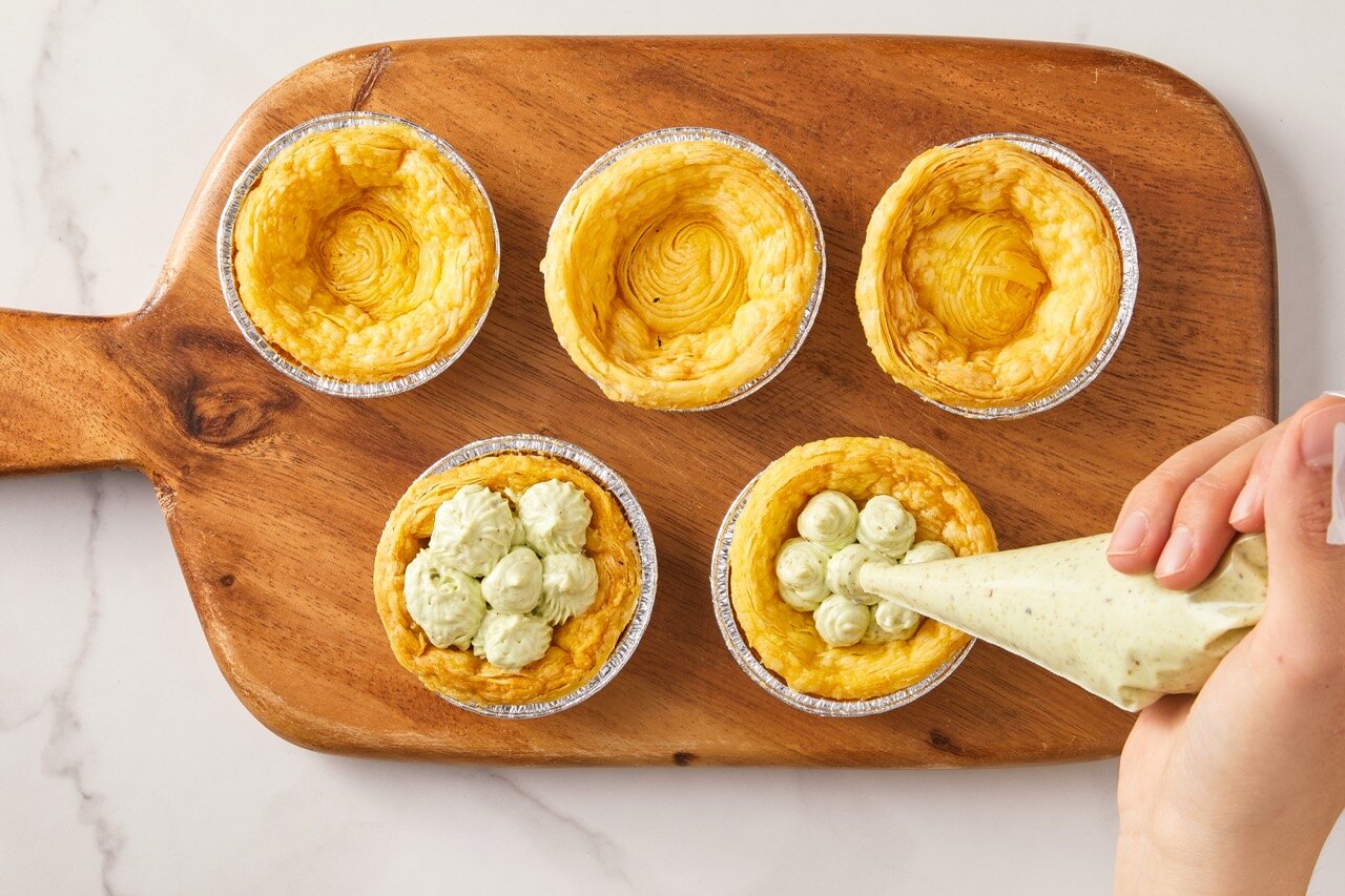 짤주머니에 크림을 넣고, 구운 타르트 쉘에 올려 주세요.