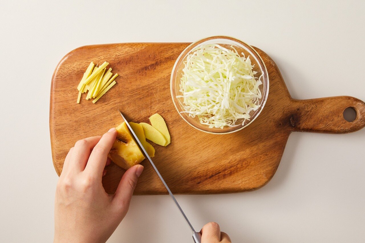 깨끗이 씻은 생강과 양배추를 얇게 채 썰어 준비해 주세요.