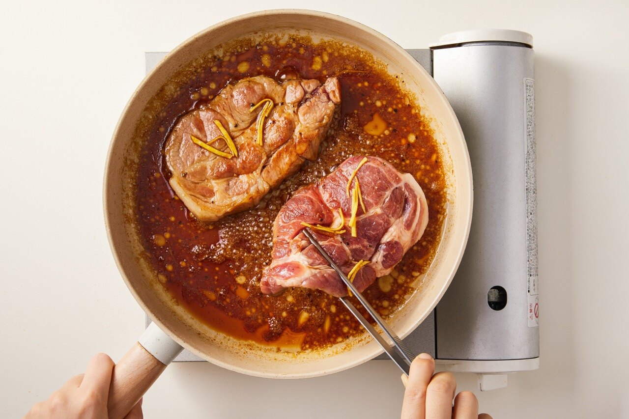 달군 프라이팬에 밑간한 고기를 넣고 중불에 뒤집어가며 익혀 주세요.