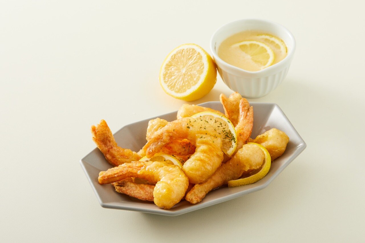 입맛 돋우는 레몬 소스를 곁들인 새우 튀김으로