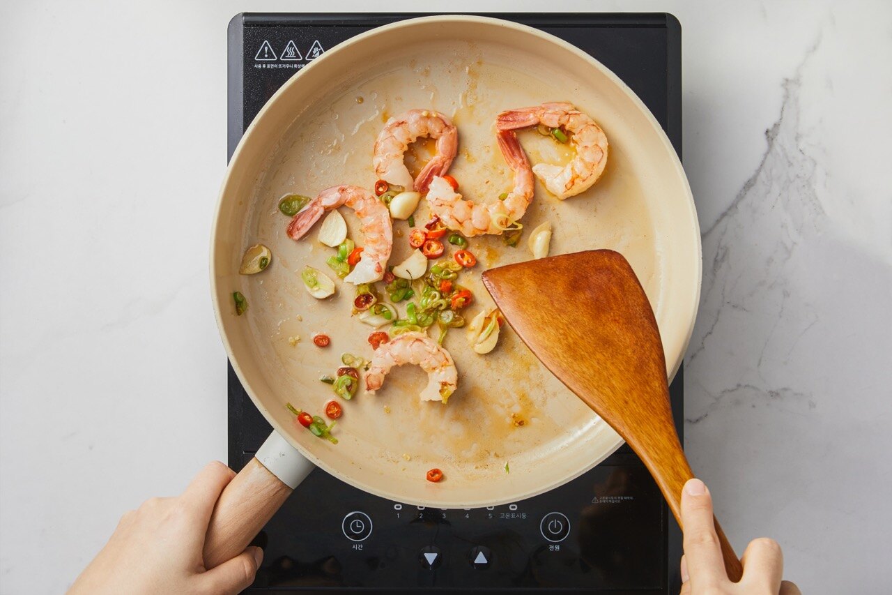 식용유 1T를 두른 팬에 새우와 고추, 마늘, 대파를 넣고 새우가 반 정도 익을 때까지 볶아 주세요.