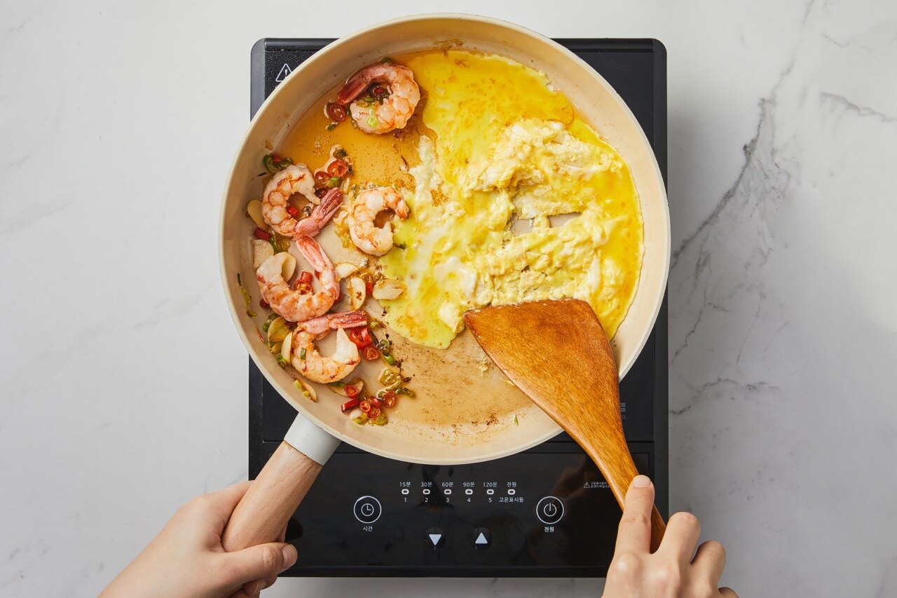 볶아둔 새우와 채소를 한켠에 둔 후, 준비한 달걀을 넣고 스크램블을 만들어 주세요.