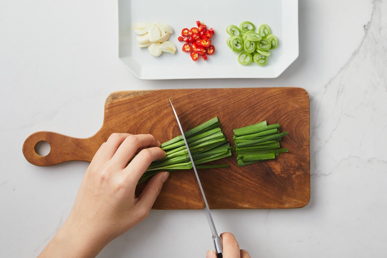 부추는 새끼 손가락 길이, 마늘은 편 썰기, 대파와 베트남 고추(쥐똥고추)는 송송 썰어 준비해 주세요.