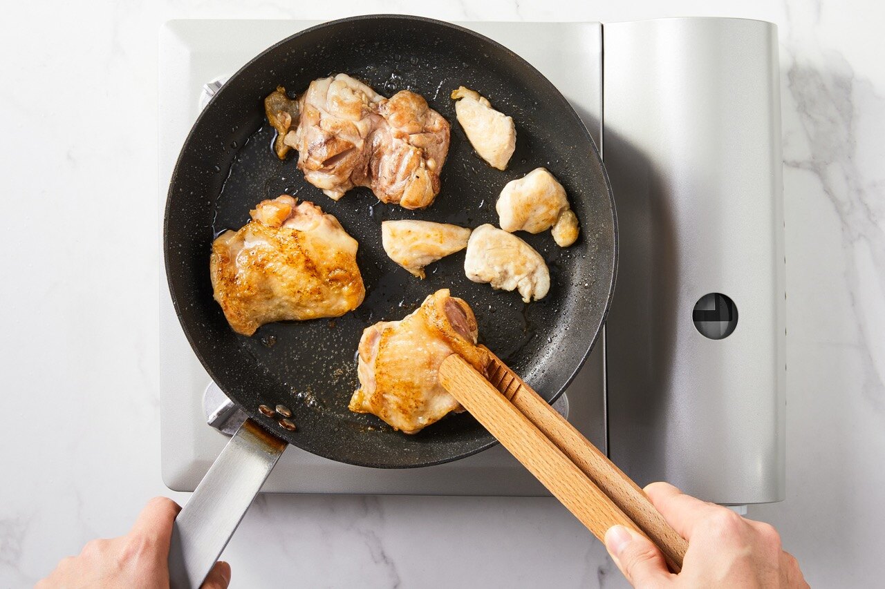 닭고기 정육을 예열한 후라이팬에서 구워 준비해 주세요.