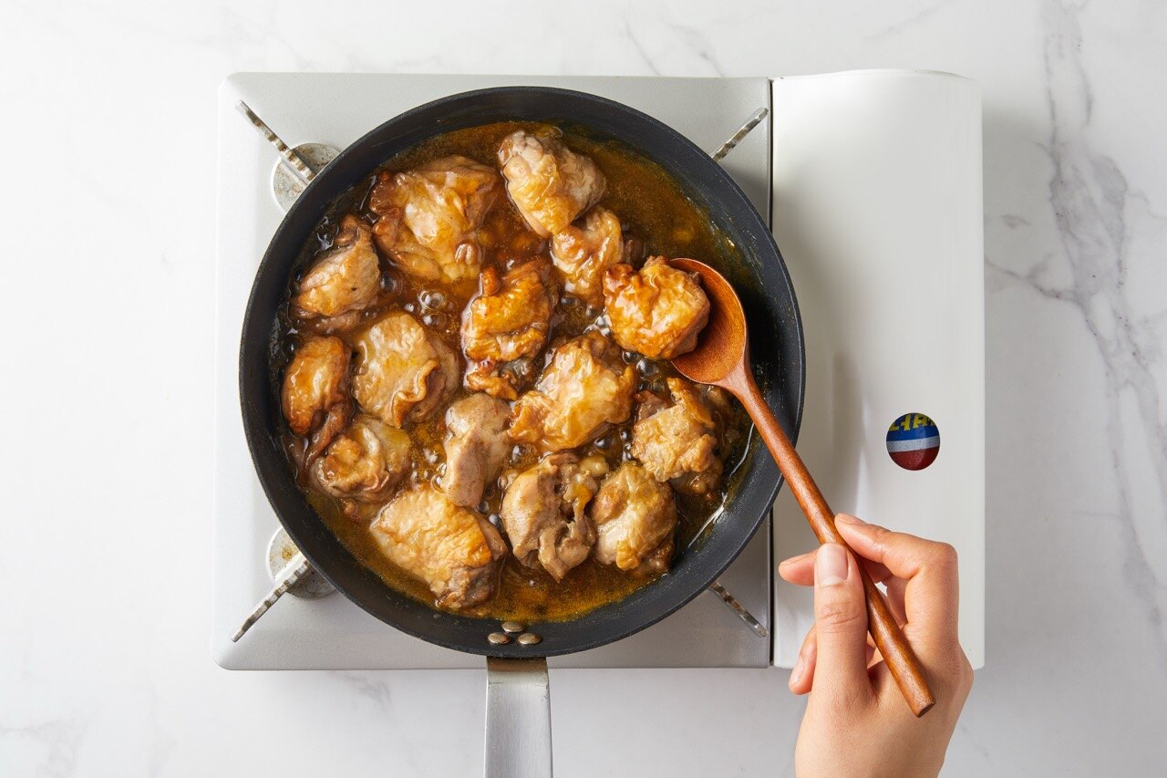 소스에 점성이 생기면 치킨을 넣고 3분간 골고루 저어가며 볶아 주세요.
