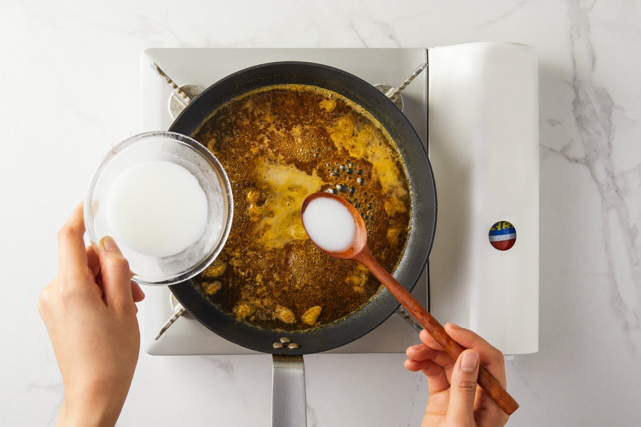 만들어 놓은 소스에 전분물(옥수수 전분 1큰술 + 물 2큰술)을 넣고 약불에서 졸여 주세요.
