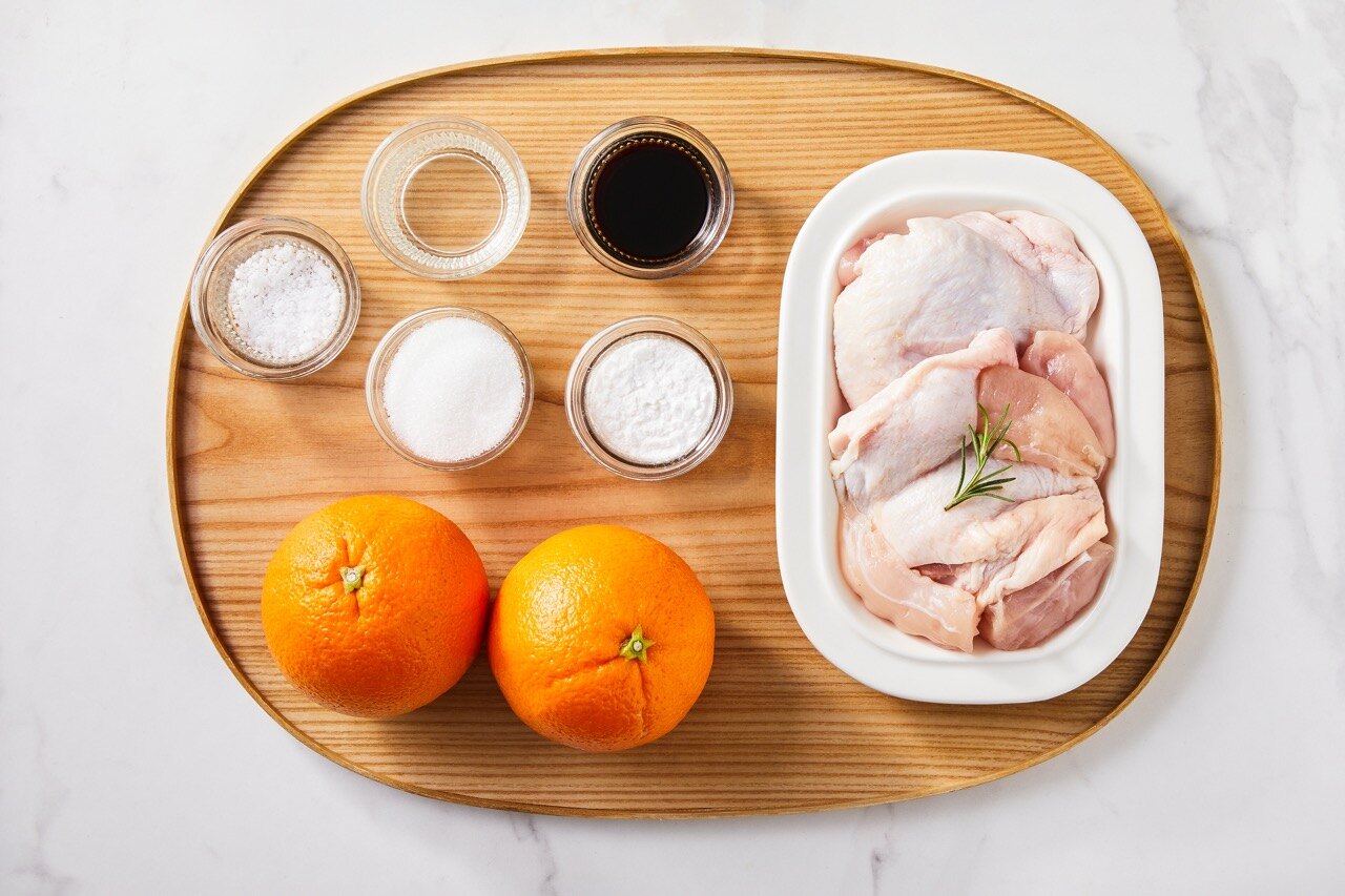 오븐에 담백하게 구운 치킨에 갓 짠 신선한 오렌지를
