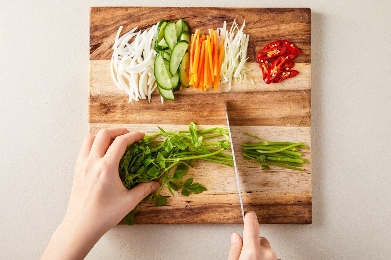 양파, 당근, 대파는 채썰고 오이와 홍고추는 어슷썰기, 미나리는 채썰어 둔 채소 길이만큼 잘라 주세요.