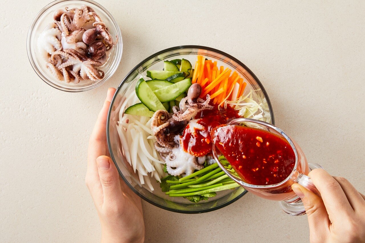 데친 주꾸미와 썰어둔 채소, 양념장을 잘 버무려 주세요.