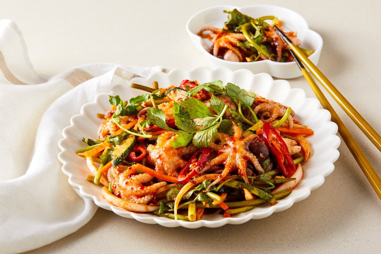 그릇에 정갈하게 담아주면 매콤새콤한 주꾸미 초무침 완성이에요.