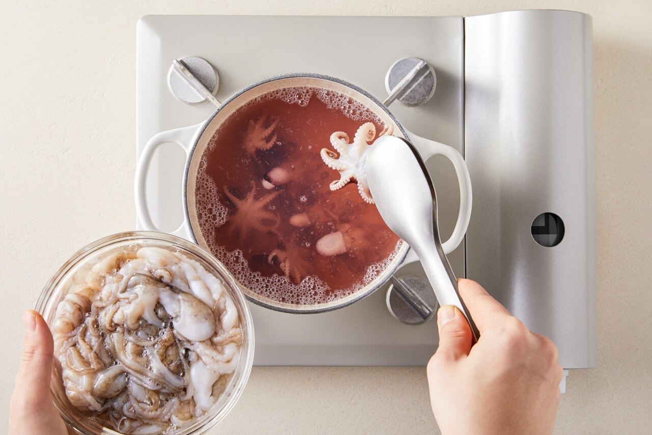 깨끗하게 손질한 주꾸미는 끓는 물에 1분간 데쳐 주세요.