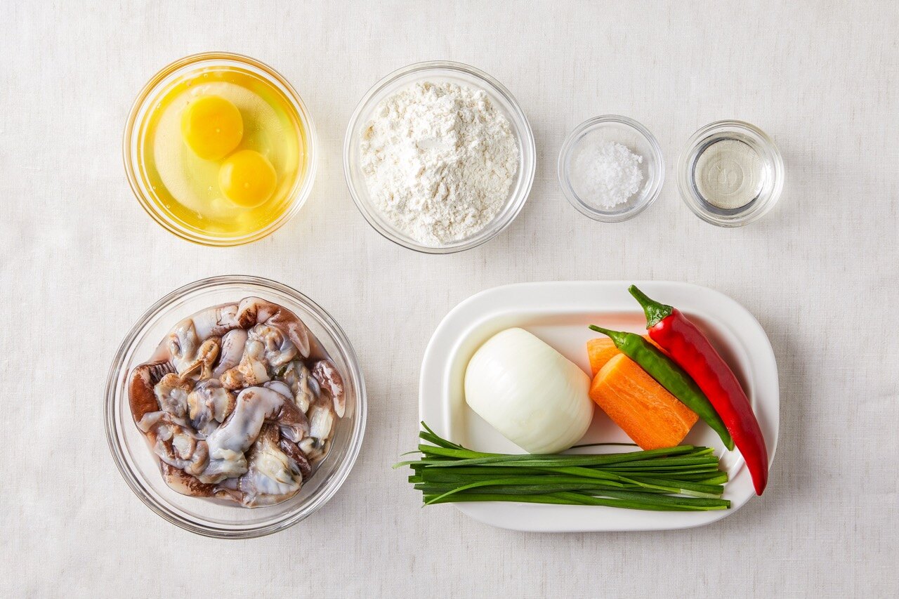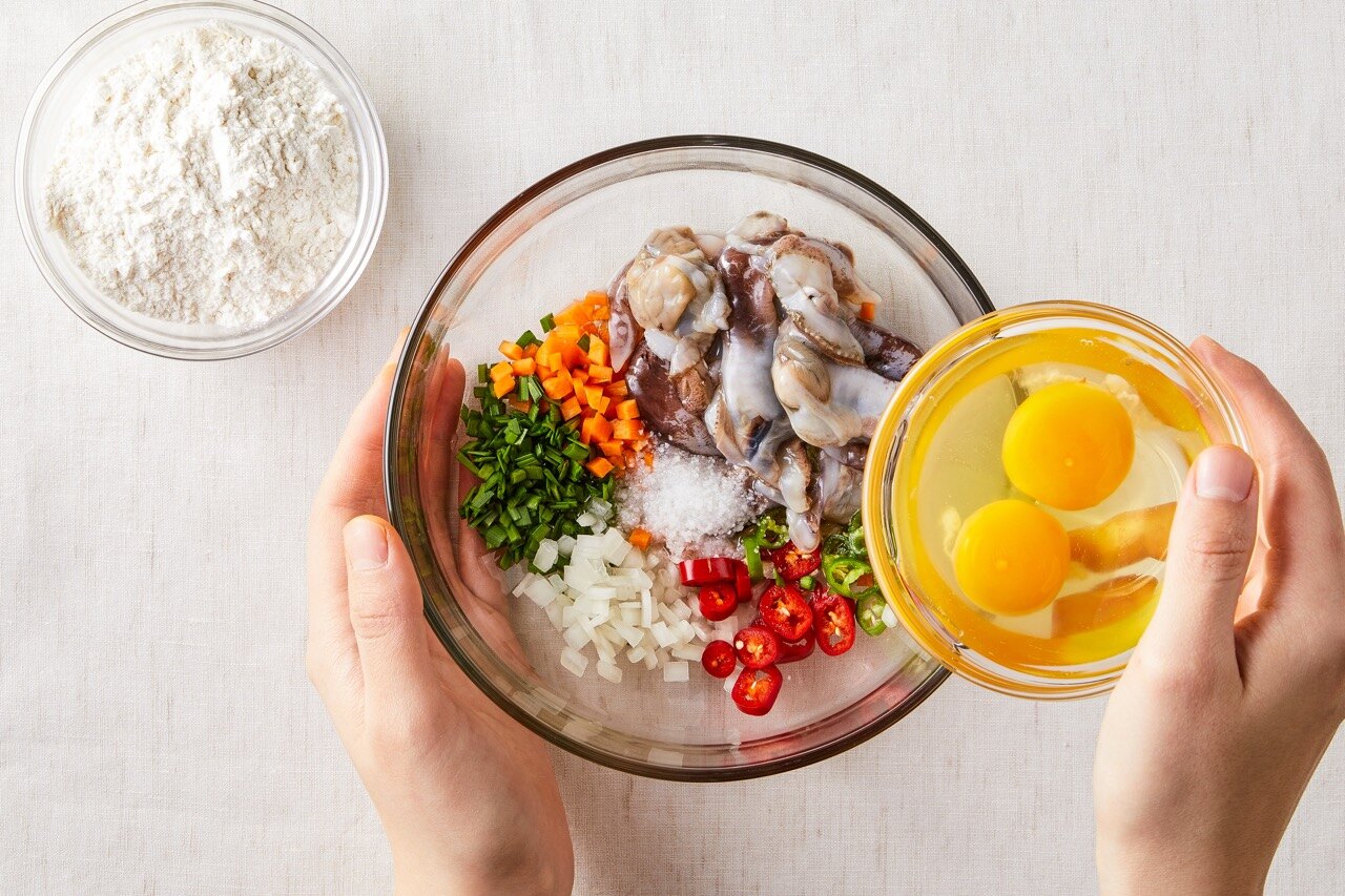 썰어둔 채소와 새조개, 달걀, 튀김가루, 물 20ml를 빈 그릇에 담아 주세요.