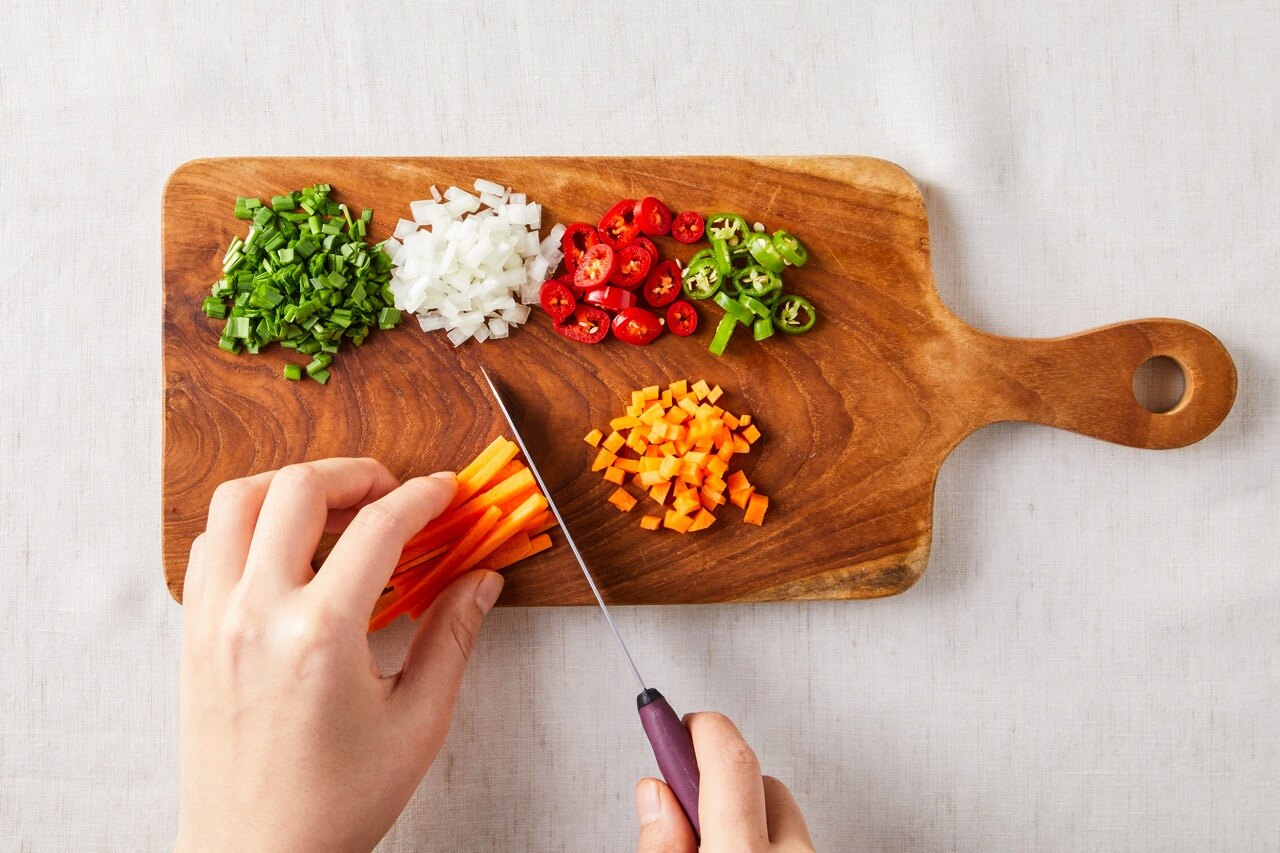깨끗이 세척한 양파와 부추, 당근은 잘게 다지고 청홍고추는 송송 썰어 준비해 주세요.