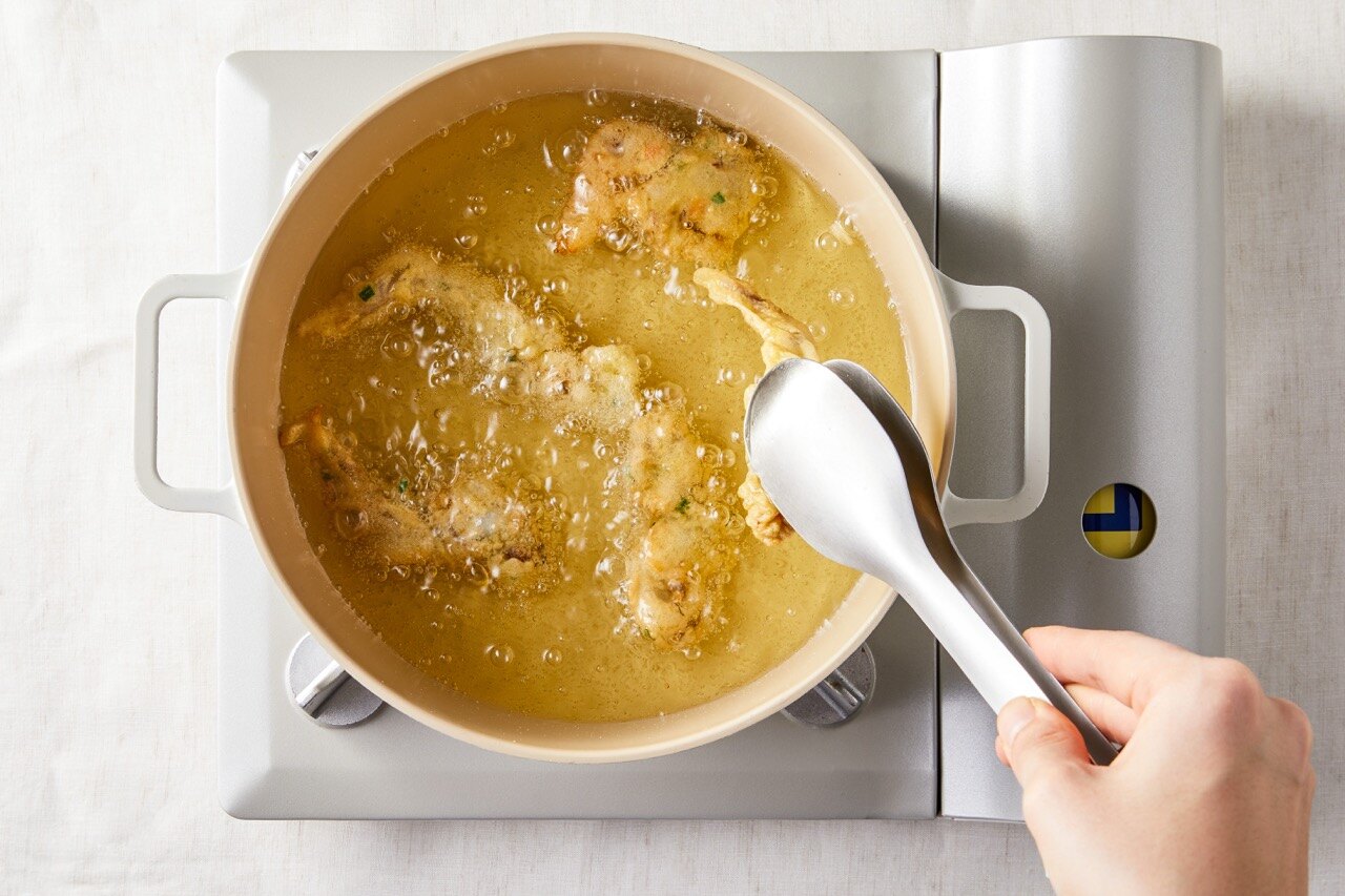180도의 기름에서 새조개를 노릇하게 튀겨 주세요.