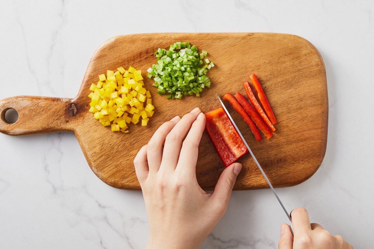 깨끗이 씻은 파프리카와 오이를 잘게 다져 주세요.