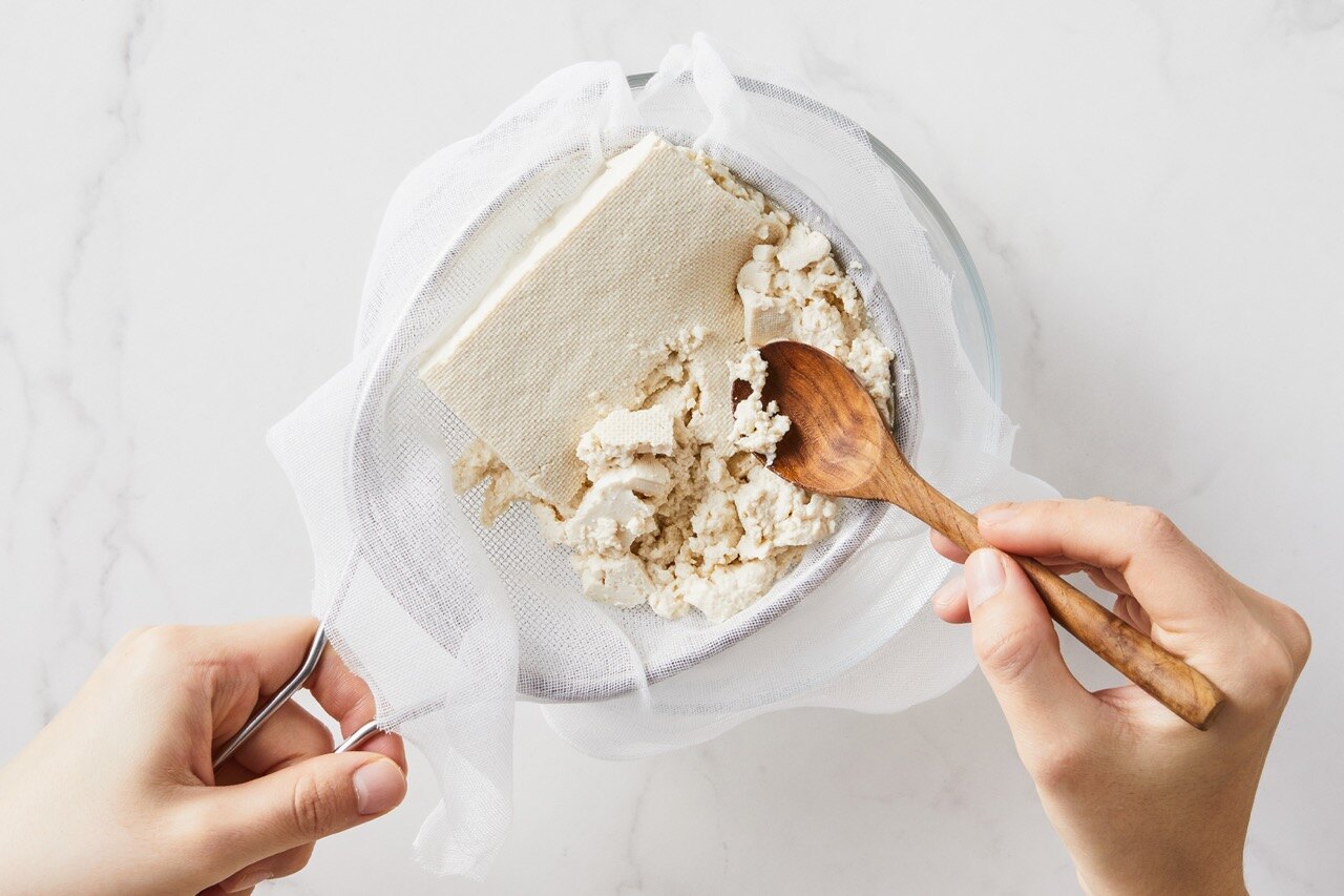 구멍이 촘촘한 체나 거즈에 두부를 넣고 으깬 뒤, 물을 쭉 짜내 주세요.