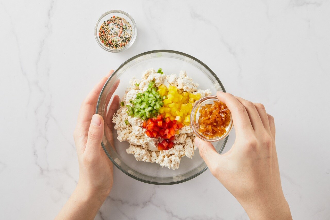 으깬 두부와 다진 채소, 다진 단무지 그리고 야채 후레이크를 한데 넣고 골고루 섞어 주세요.