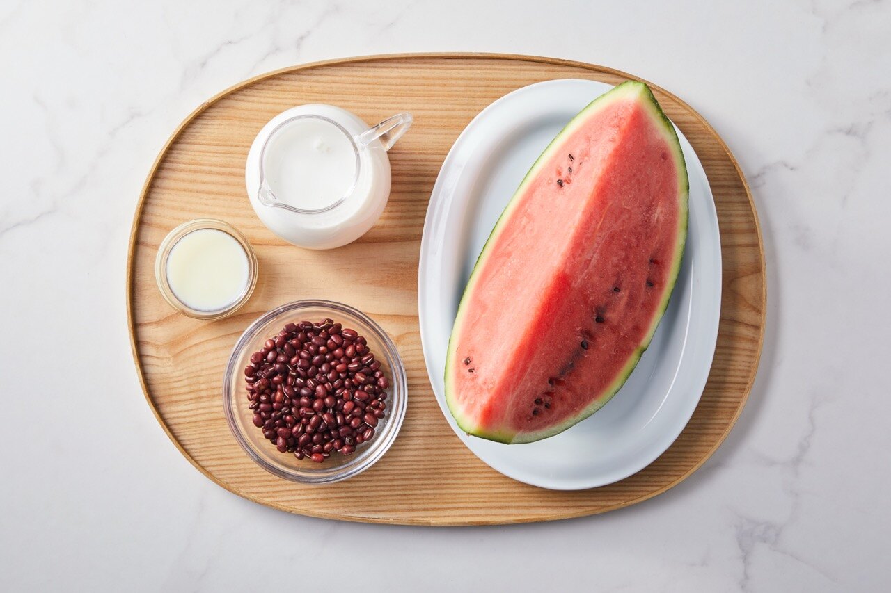 갈아 둔 수박에 삶은 팥을 넣고 섞어 주세요.