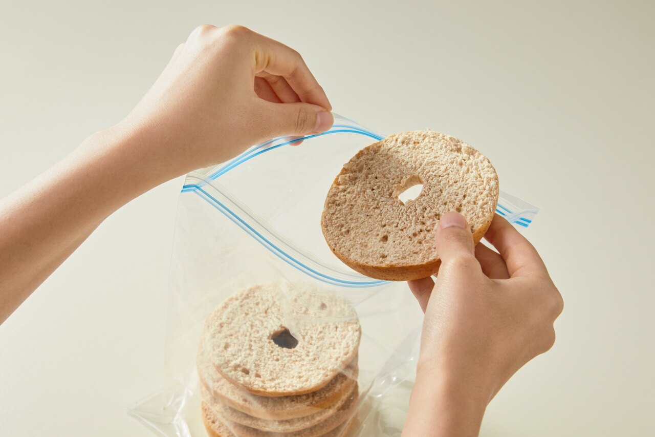 쌓은 베이글은 지퍼 백이나 비닐 봉지에 담은 후