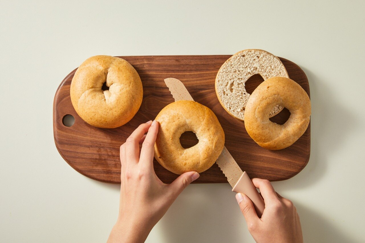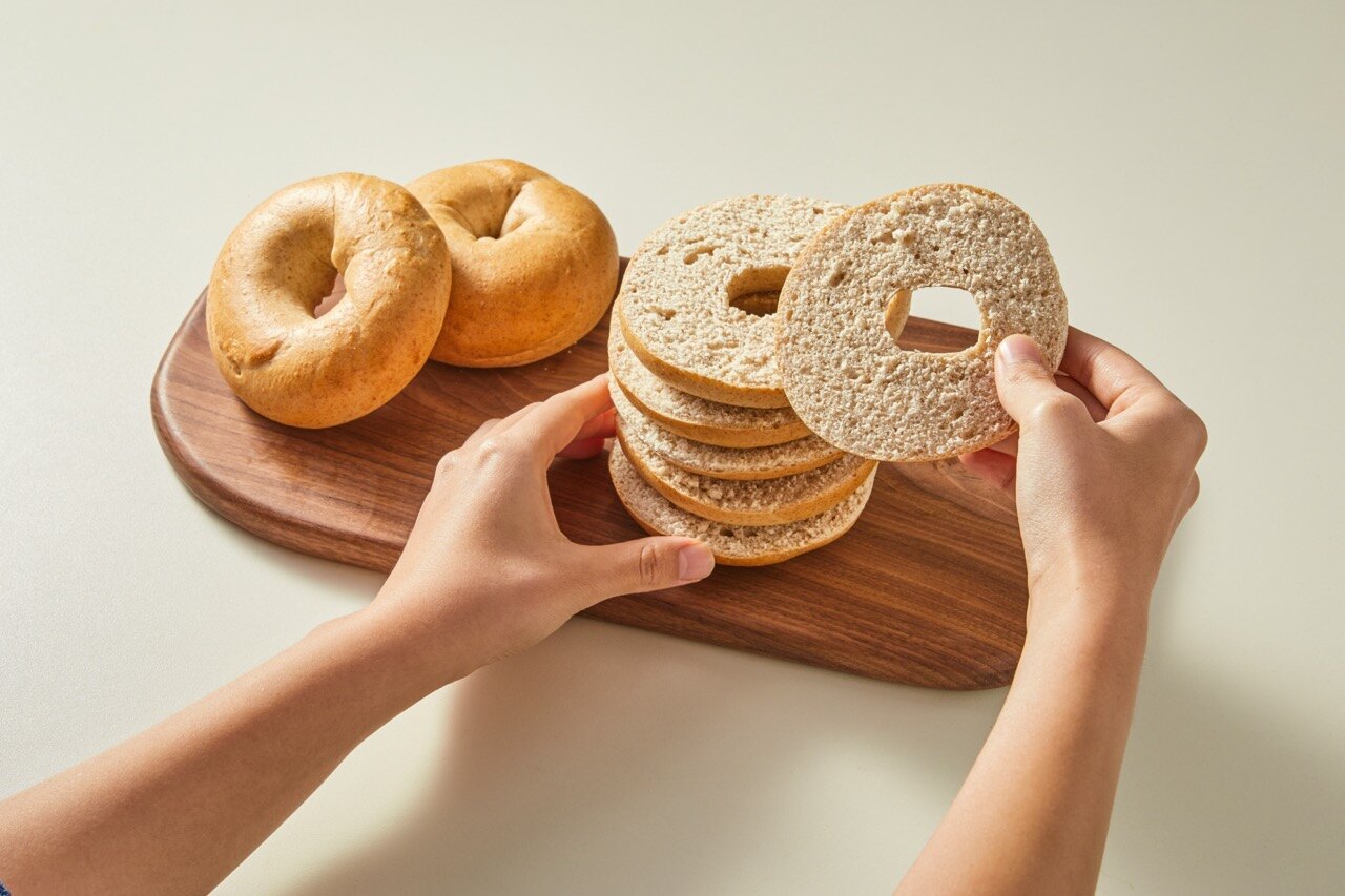 실온 보관중인 베이글을 가로로 잘라 준비해 주세요.