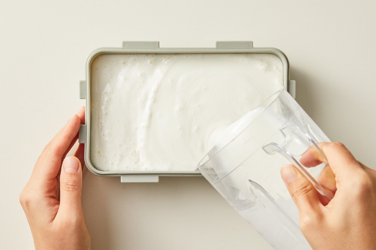 평평한 용기에 내용물을 옮겨 담은 뒤, 6시간 이상 얼려주면 홈메이드 요거트 아이스크림 완성입니다!