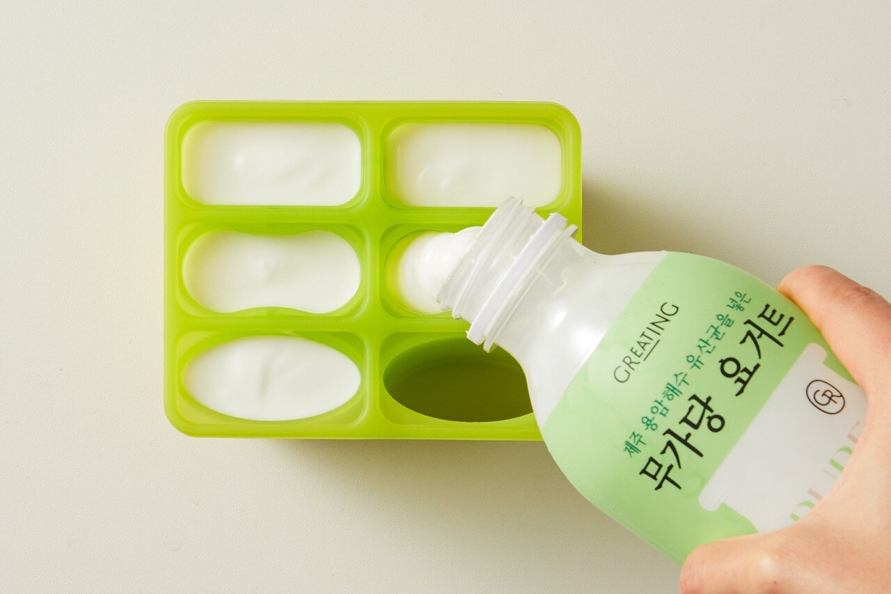 무가당 요거트를 얼음 틀에 넣은 뒤, 냉동실에서 6시간 이상 얼려주세요.