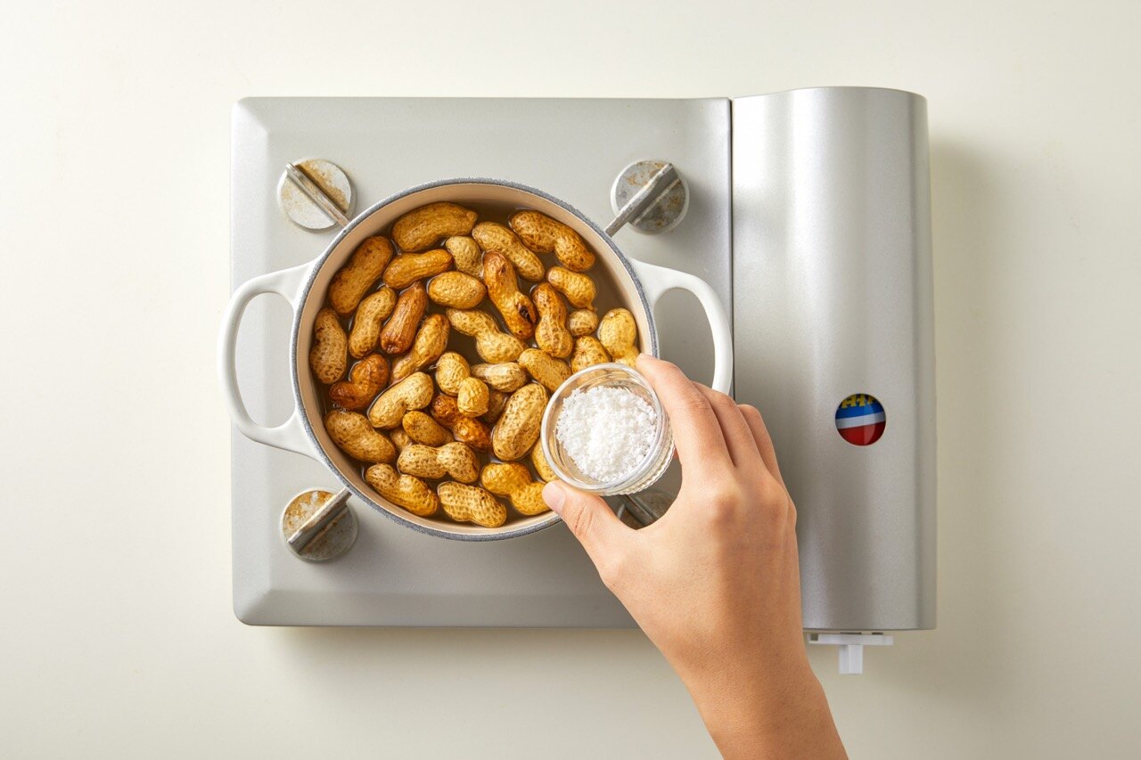 냄비에 땅콩이 잠길 정도로 물을 담은 뒤, 소금을 넣어 주세요.
