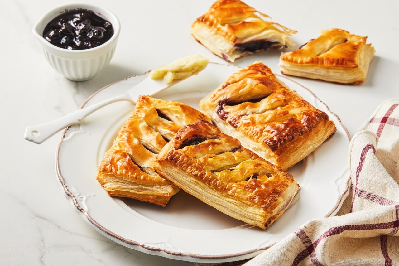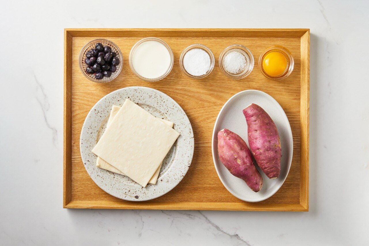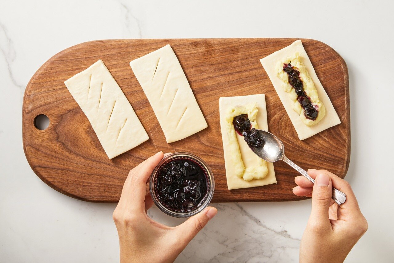 이등분한 생지 페스츄리 시트 위로 고구마 반죽을 네모 형태로 짜준 뒤, 그 속을 블루베리 콩포트로 채워 주세요.