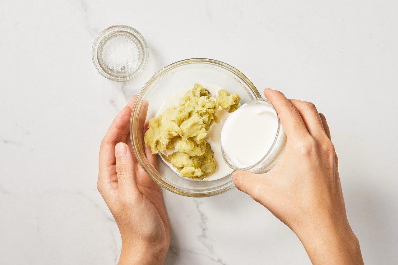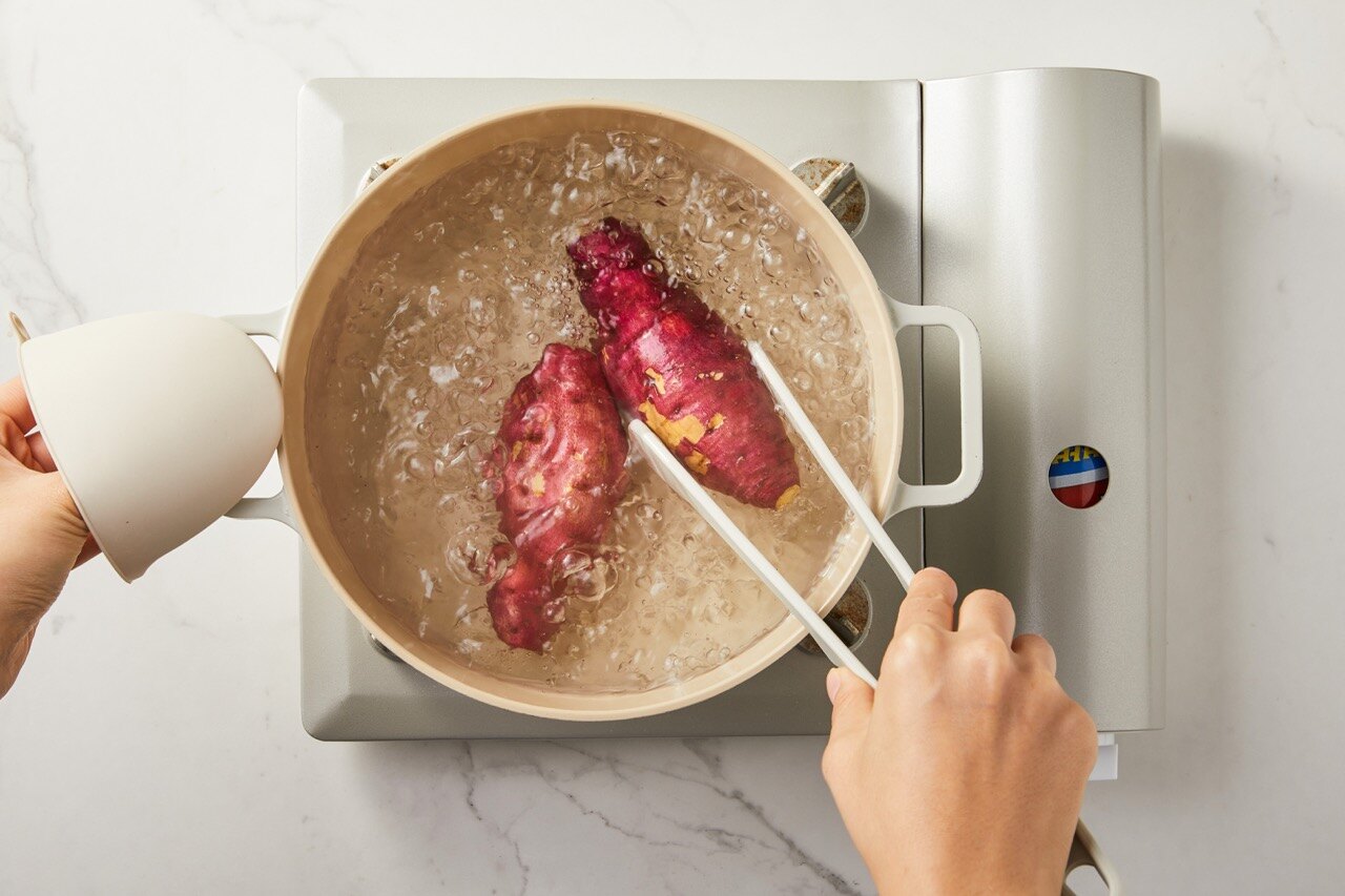 끓는 물에 고구마를 삶은 뒤, 으깨 주세요.