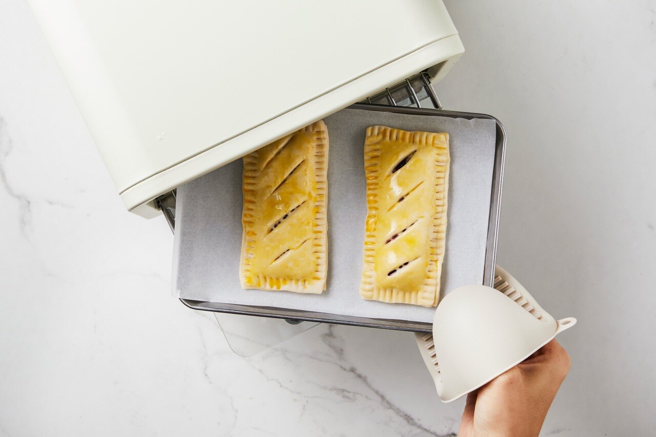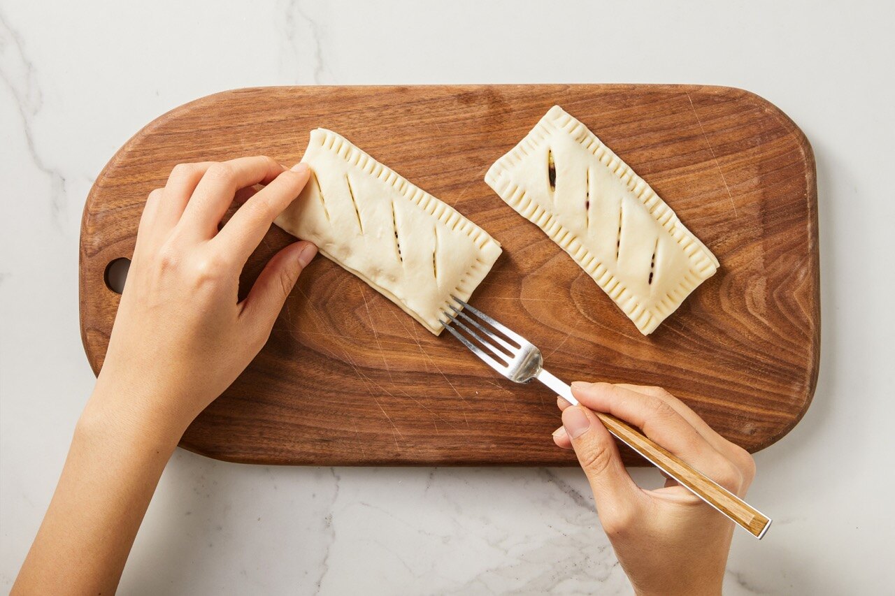 남겨둔 페스츄리 시트를 덮은 뒤, 포크로 가장자리를 꾹 눌러주며 닫아주세요.