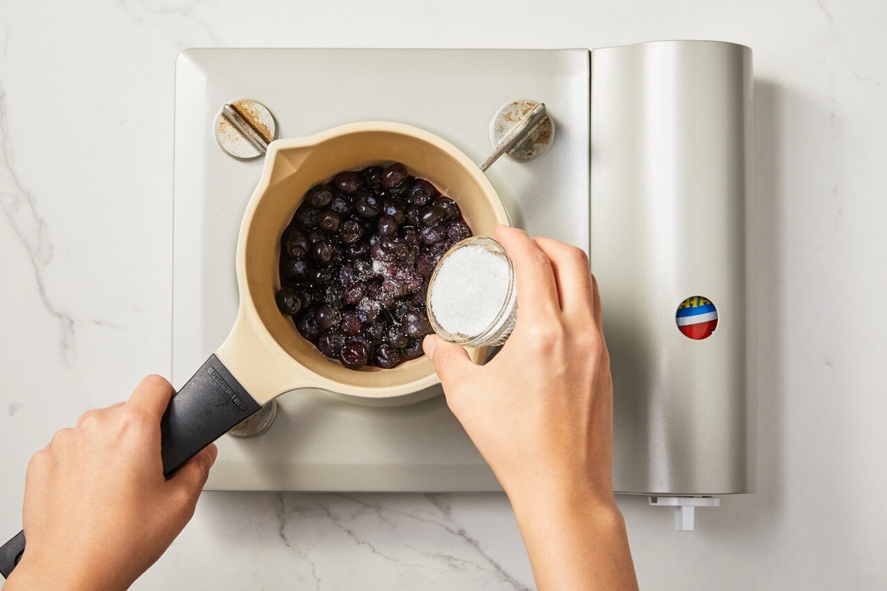 냄비에 블루베리와 설탕을 넣고 콩포트를 만들어 주세요.