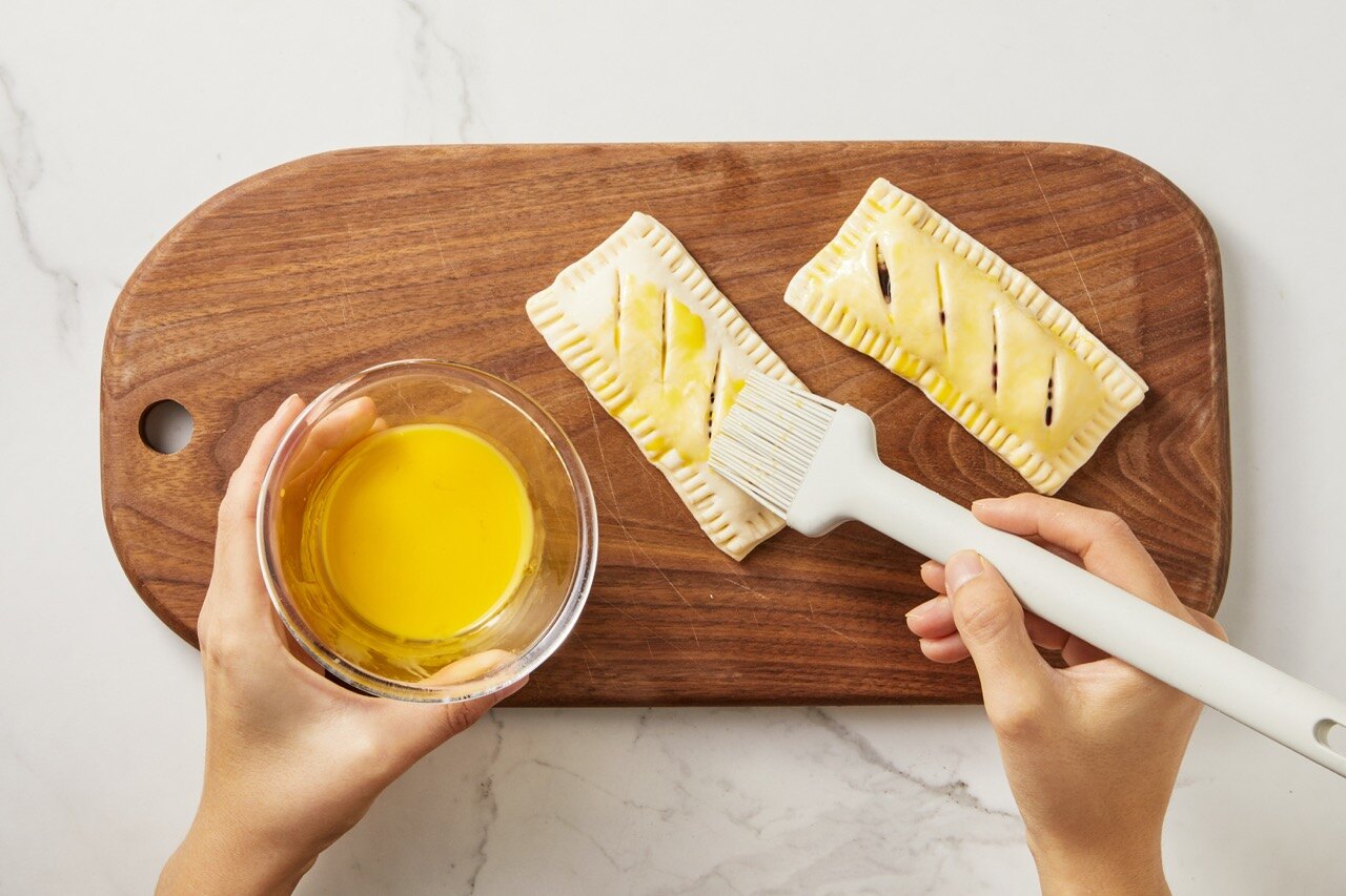 노른자를 풀어 계란 물을 만든 뒤, 시트 위로 적당량 발라 주세요.