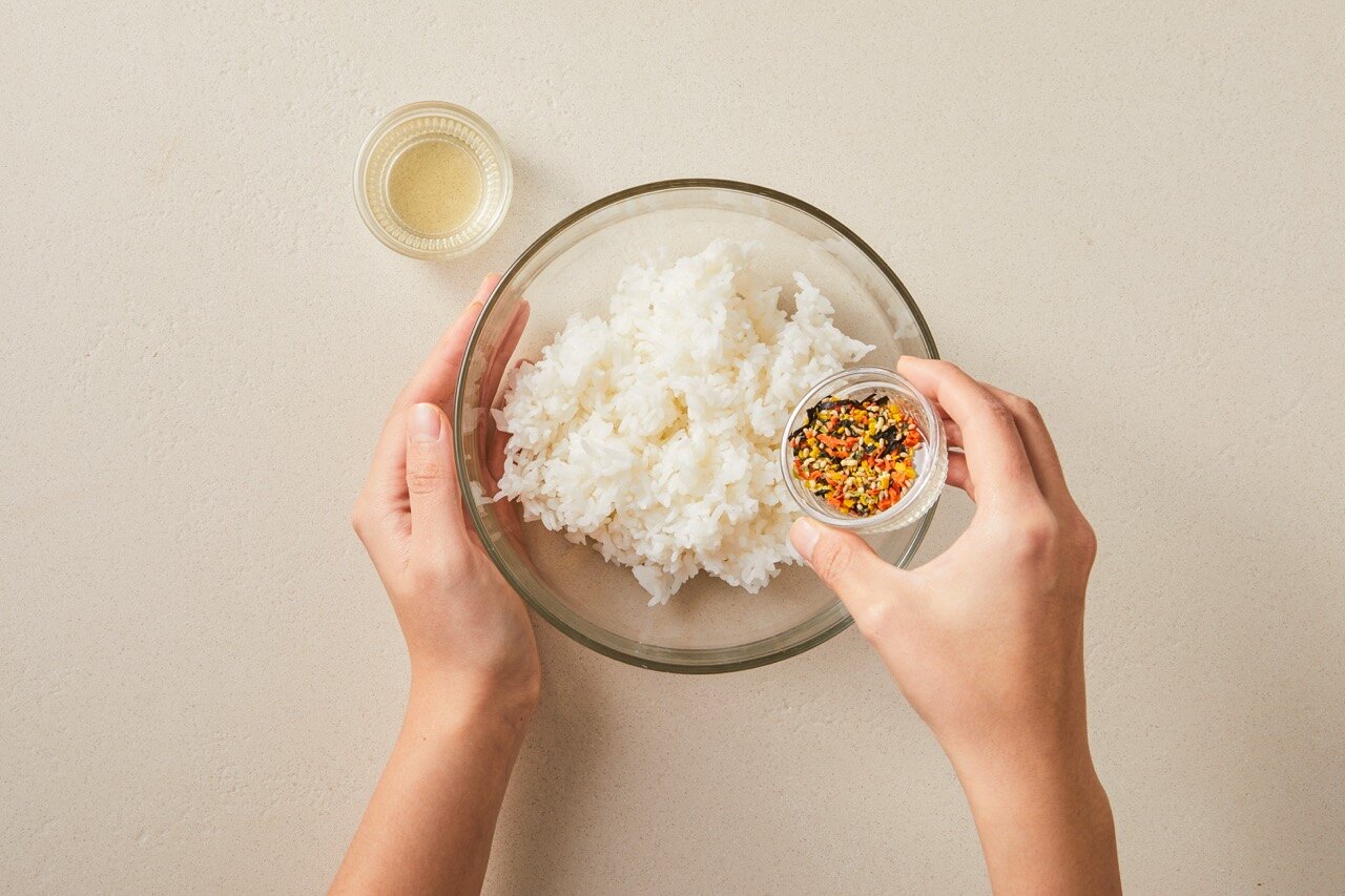 쌀밥에 야채 후레이크와 단촛물을 넣은 뒤, 잘 섞어 주세요.