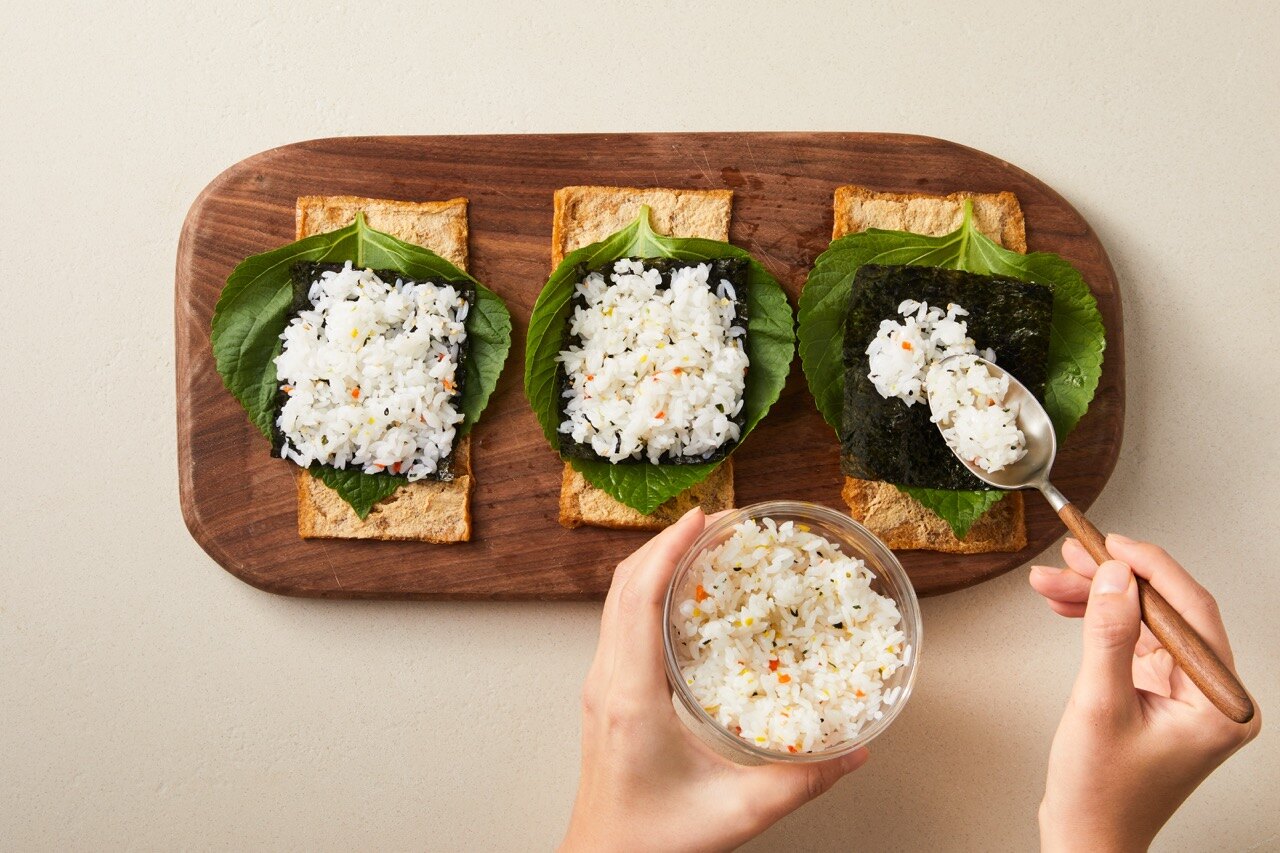 롤 유부 위에 깻잎과 김을 얹은 뒤, 밥을 고루 펴 올려 주세요.